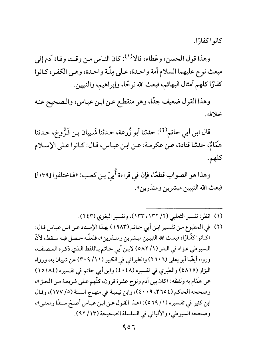 (¬٢) في المطبوع من تفسير ابن أبي حاتم (١٩٨٣) بهذا الإسناد عن ابن عباس قال: «كانوا كفّارًا، فبعث الله النبيين مبشرين ومنذرين»، فلعلّه حصل فيه سقط، لأنّ السيوطي عزاه في الدر (١/ ٥٨٢) لابن أبي حاتم باللفظ الذي ذكره المصنف، ورواه أيضًا أبو يعلى (٢٦٠٦) والطبراني في الكبير (١١/ ٣٠٩) عن شيبان به، ورواه البزار (٤٨١٥) والطبري في تفسيره (٤٠٤٨) وابن أبي حاتم في تفسيره (١٥١٨٤) عن هَمّام به ولفظه: «كان بين آدم ونوح عشرة قرون، كلّهم على شريعة من الحق»، وصححه الحاكم (٣٦٥٤، ٤٠٠٩)، وابن تيمية في منهاج السنة (٥/ ١٧٧)، وقال ابن كثير في تفسيره (١/ ٥٦٩): «هذا القول عن ابن عباس أصحّ سندًا ومعنى»، وصححه السيوطي، والألباني في السلسلة الصحيحة (١٣/ ٩٢).
