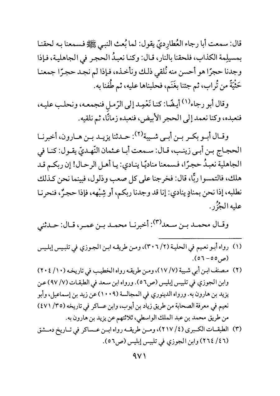 وقال أبو رجاء (¬١) أيضًا: كنا نَعْمِد إلى الرّملِ فنجمعه، ونحلب عليه، فنعبده، وكنا نعمد إلى الحجر الأبيض، فنعبده زمانًا، ثم نلقيه.