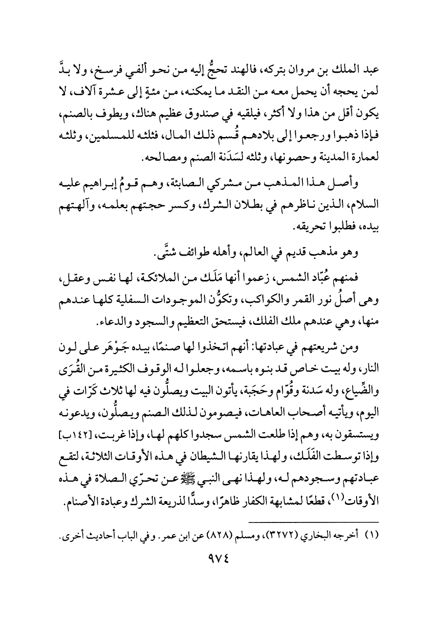 ومن شريعتهم في عبادتها: أنهم اتخذوا لها صنمًا، بيده جَوْهَر على لون النار، وله بيت خاص قد بنوه باسمه، وجعلوا له الوقوف الكثيرة من القُرَى والضِّياع، وله سَدنة وقُوّام وحَجَبة، يأتون البيت ويصلُّون فيه لها ثلاث كَرّات في اليوم، ويأتيه أصحاب العاهات، فيصومون لذلك الصنم ويصلُّون، ويدعونه ويستسقون به، وهم إذا طلعت الشمس سجدوا كلهم لها، وإذا غربت، [١٤٢ ب] وإذا توسطت الفَلَك، ولهذا يقارنها الشيطان في هذه الأوقات الثلاثة، لتقع عبادتهم وسجودهم له، ولهذا نهى النبي - صلى الله عليه وسلم - عن تحرّي الصلاة في هذه الأوقات (¬١)، قطعًا لمشابهة الكفار ظاهرًا، وسدًّا لذريعة الشرك وعبادة الأصنام.