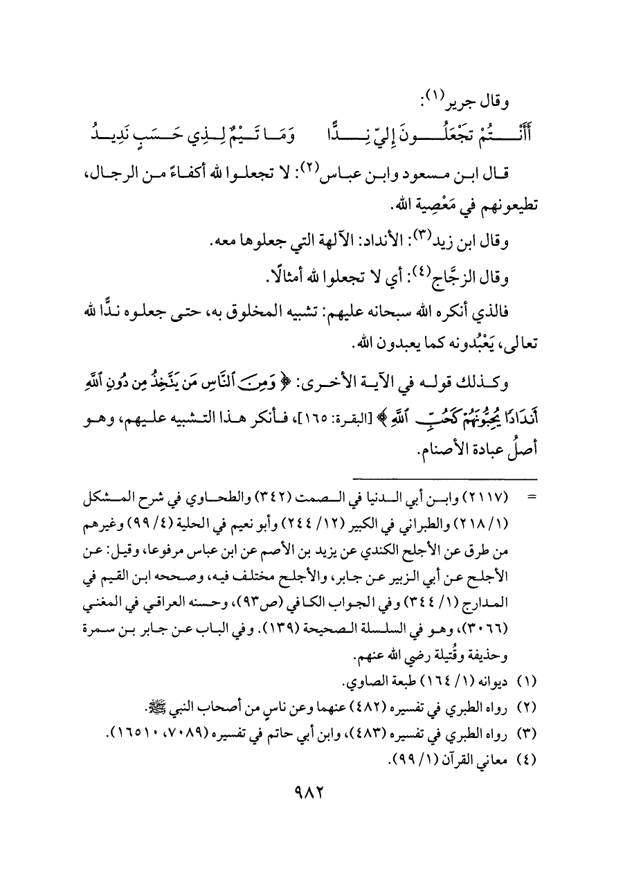 وكذلك قوله في الآية الأخرى: {وَمِنَ النَّاسِ مَنْ يَتَّخِذُ مِنْ دُونِ اللَّهِ أَنْدَادًا يُحِبُّونَهُمْ كَحُبِّ اللَّهِ} [البقرة: ١٦٥]، فأنكر هذا التشبيه عليهم، وهو أصلُ عبادة الأصنام.