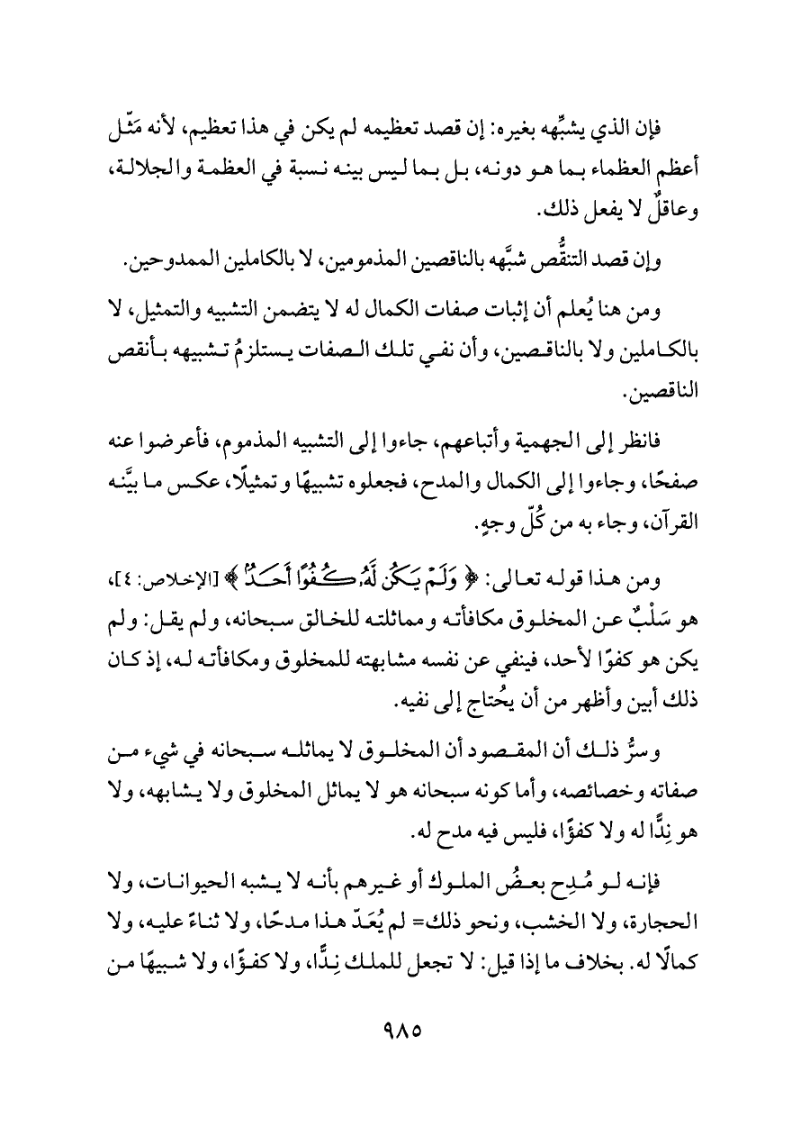 ومن هنا يُعلم أن إثبات صفات الكمال له لا يتضمن التشبيه والتمثيل، لا بالكاملين ولا بالناقصين، وأن نفي تلك الصفات يستلزمُ تشبيهه بأنقص الناقصين.