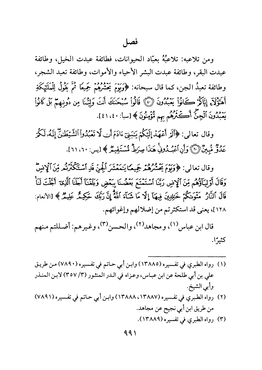 ومن تلاعبه: تلاعبُهُ بعبّاد الحيوانات، فطائفة عبدت الخيل، وطائفة عبدت البقر، وطائفة عبدت البشر الأحياء والأموات، وطائفة تعبد الشجر، وطائفة تعبدُ الجن، كما قال سبحانه: {وَيَوْمَ يَحْشُرُهُمْ جَمِيعًا ثُمَّ يَقُولُ لِلْمَلَائِكَةِ أَهَؤُلَاءِ إِيَّاكُمْ كَانُوا يَعْبُدُونَ (٤٠) قَالُوا سُبْحَانَكَ أَنْتَ وَلِيُّنَا مِنْ دُونِهِمْ بَلْ كَانُوا يَعْبُدُونَ الْجِنَّ أَكْثَرُهُمْ بِهِمْ مُؤْمِنُونَ} [سبأ: ٤٠، ٤١].