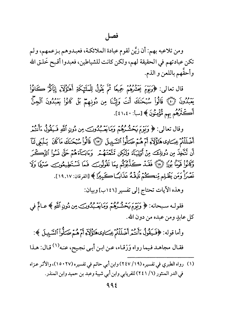 وقال تعالى: {وَيَوْمَ يَحْشُرُهُمْ وَمَا يَعْبُدُونَ مِنْ دُونِ اللَّهِ فَيَقُولُ أَأَنْتُمْ أَضْلَلْتُمْ عِبَادِي هَؤُلَاءِ أَمْ هُمْ ضَلُّوا السَّبِيلَ (١٧) قَالُوا سُبْحَانَكَ مَا كَانَ يَنْبَغِي لَنَا أَنْ نَتَّخِذَ مِنْ دُونِكَ مِنْ أَوْلِيَاءَ وَلَكِنْ مَتَّعْتَهُمْ وَآبَاءَهُمْ حَتَّى نَسُوا الذِّكْرَ وَكَانُوا قَوْمًا بُورًا (١٨) فَقَدْ كَذَّبُوكُمْ بِمَا تَقُولُونَ فَمَا تَسْتَطِيعُونَ صَرْفًا وَلَا نَصْرًا وَمَنْ يَظْلِمْ مِنْكُمْ نُذِقْهُ عَذَابًا كَبِيرًا} [الفرقان: ١٧ ـ ١٩].