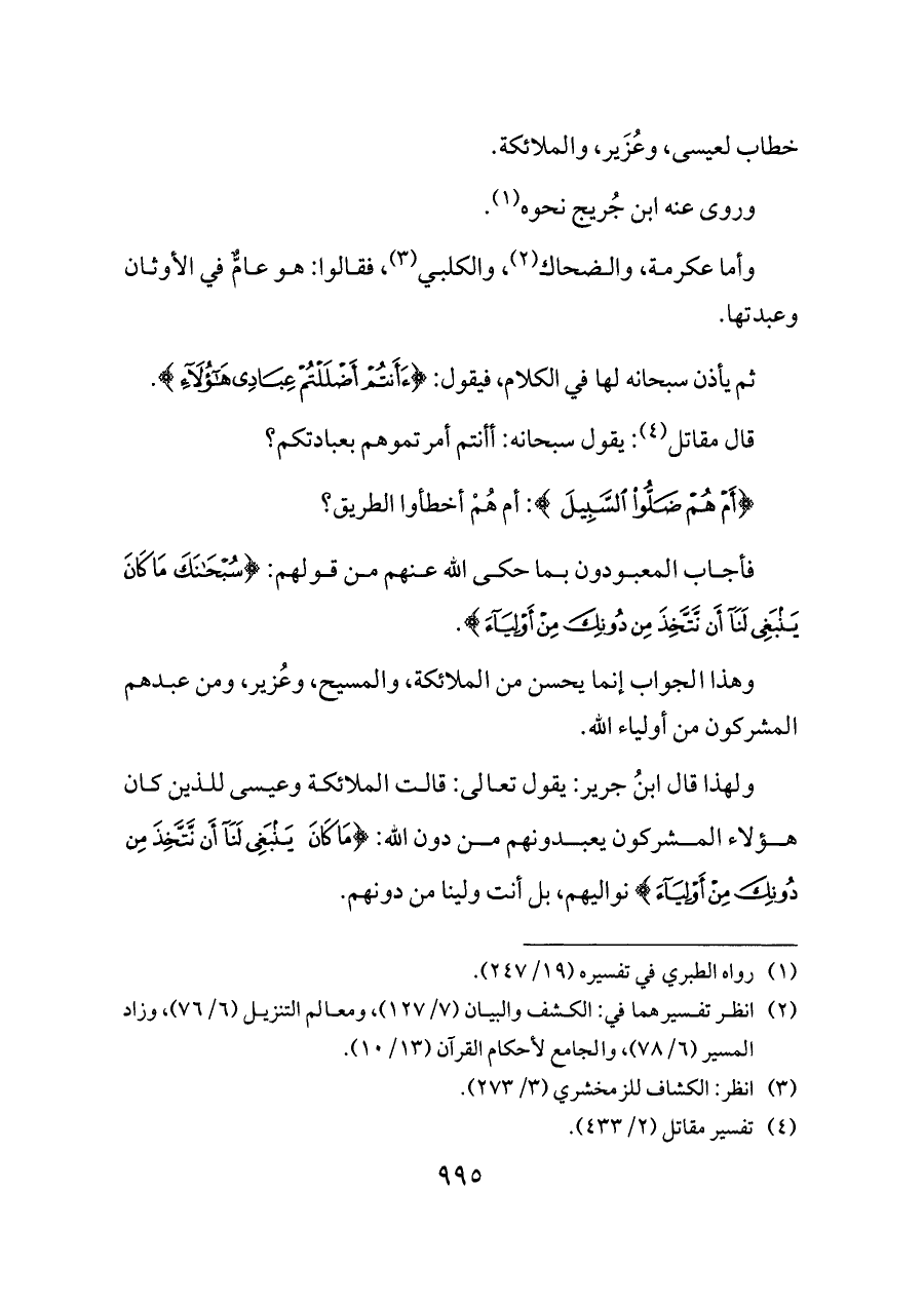 ولهذا قال ابنُ جرير: يقول تعالى: قالت الملائكة وعيسى للذين كان هؤلاء المشركون يعبدونهم من دون الله: {مَا كَانَ يَنْبَغِي لَنَا أَنْ نَتَّخِذَ مِنْ دُونِكَ مِنْ أَوْلِيَاءَ} نواليهم، بل أنت ولينا من دونهم.