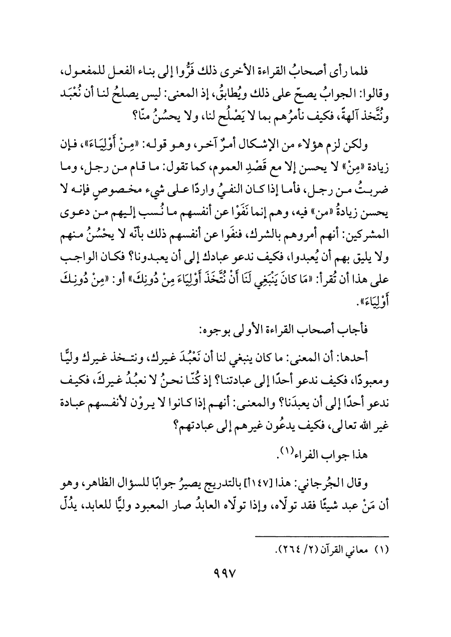 ولكن لزم هؤلاء من الإشكال أمرٌ آخر، وهو قوله: «مِنْ أَوْلِيَاءَ»، فإن زيادة «مِنْ» لا يحسن إلا مع قَصْدِ العموم، كما تقول: ما قام من رجل، وما ضربتُ من رجل، فأما إذا كان النفيُ واردًا على شيء مخصوصٍ فإنه لا يحسن زيادةُ «من» فيه، وهم إنما نَفَوْا عن أنفسهم ما نُسب إليهم من دعوى المشركين: أنهم أمروهم بالشرك، فنفَوا عن أنفسهم ذلك بأنّه لا يحْسُنُ منهم ولا يليق بهم أن يُعبدوا، فكيف ندعو عبادك إلى أن يعبدونا؟ فكان الواجب على هذا أن تُقرأ: «مَا كانَ يَنْبَغِي لَنَا أَنْ نُتَّخَذَ أَوْلِيَاءَ مِنْ دُونِكَ» أو: «مِنْ دُونِكَ أَوْلِيَاءَ».