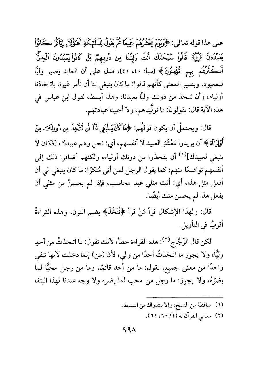 على هذا قوله تعالى: {وَيَوْمَ يَحْشُرُهُمْ جَمِيعًا ثُمَّ يَقُولُ لِلْمَلَائِكَةِ أَهَؤُلَاءِ إِيَّاكُمْ كَانُوا يَعْبُدُونَ (٤٠) قَالُوا سُبْحَانَكَ أَنْتَ وَلِيُّنَا مِنْ دُونِهِمْ بَلْ كَانُوا يَعْبُدُونَ الْجِنَّ أَكْثَرُهُمْ بِهِمْ مُؤْمِنُونَ} [سبأ: ٤٠، ٤١]، فدل على أن العابد يصير وليًّا للمعبود. ويصير المعنى كأنهم قالوا: ما كان ينبغي لنا أن نأمر غيرنا باتخاذنا أولياء، وأن نتخذ من دونك وليًّا يعبدنا، وهذا أبسط، لقول ابن عباس في هذه الآية قال: يقولون: ما تولَّيناهم، ولا أحببنا عبادتهم.