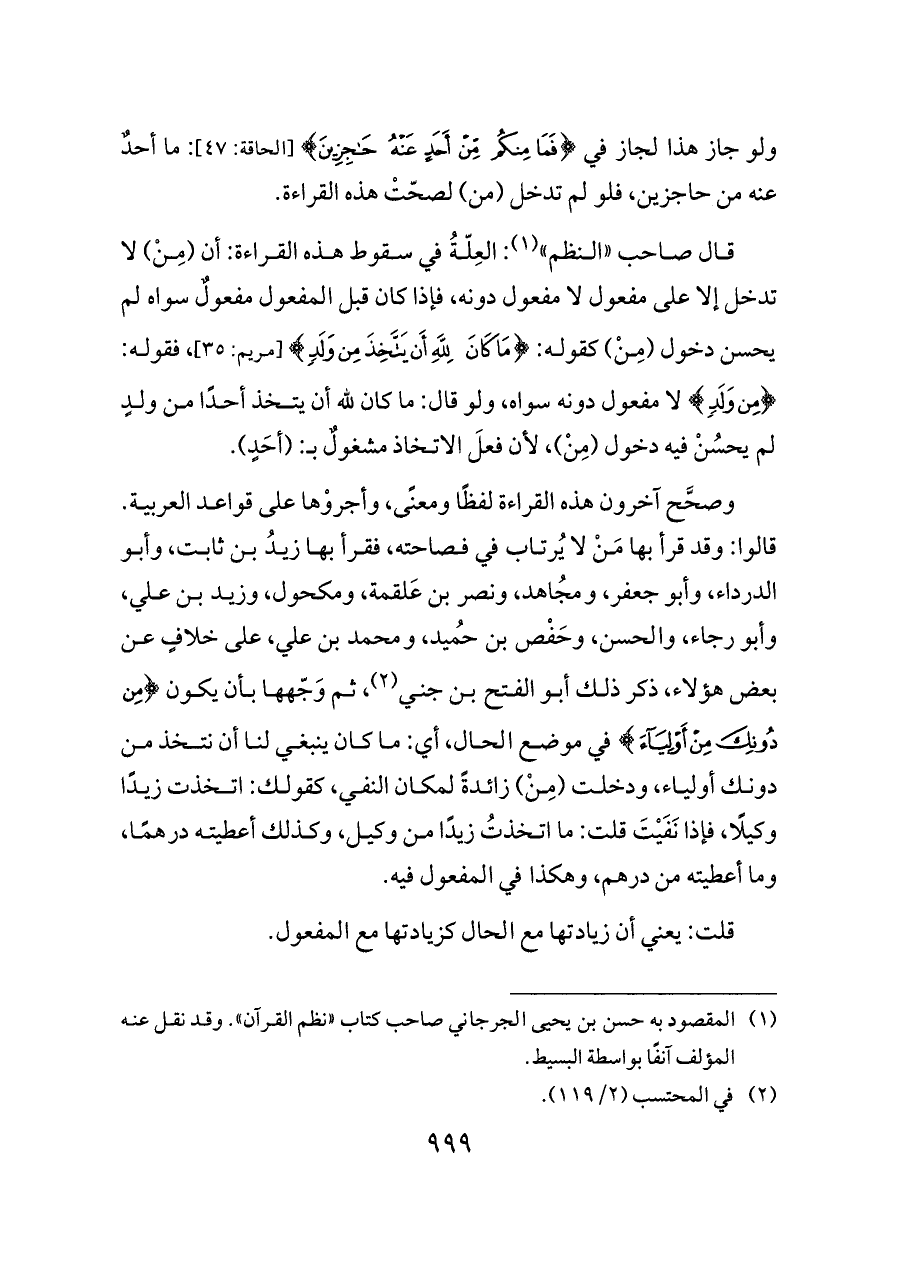 وصحَّح آخرون هذه القراءة لفظًا ومعنًى، وأجروْها على قواعد العربية. قالوا: وقد قرأ بها مَنْ لا يُرتاب في فصاحته، فقرأ بها زيدُ بن ثابت، وأبو الدرداء، وأبو جعفر، ومُجاهد، ونصر بن عَلقمة، ومكحول، وزيد بن علي، وأبو رجاء، والحسن، وحَفْص بن حُميد، ومحمد بن علي، على خلافٍ عن بعض هؤلاء، ذكر ذلك أبو الفتح بن جني (¬٢)، ثم وَجّهها بأن يكون {مِنْ دُونِكَ مِنْ أَوْلِيَاءَ} في موضع الحال، أي: ما كان ينبغي لنا أن نتخذ من دونك أولياء، ودخلت (مِنْ) زائدةً لمكان النفي، كقولك: اتخذت زيدًا وكيلًا، فإذا نَفَيْتَ قلت: ما اتخذتُ زيدًا من وكيل، وكذلك أعطيته درهمًا، وما أعطيته من درهم، وهكذا في المفعول فيه.