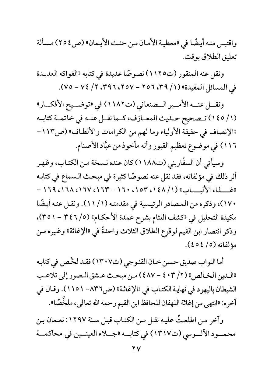 وسيأتي أن السفّاريني (ت ١١٨٨) كان عنده نسخة من الكتاب، وظهر أثر ذلك في مؤلفاته، فقد نقل عنه نصوصًا كثيرة في مبحث السماع في كتابه "غذاء الألباب" (١/ ١٤٨، ١٥٣، ١٦٠ - ١٦٣، ١٦٧، ١٦٨، ١٦٩ - ١٧٠)، وذكره من المصادر الرئيسية في مقدمته (١/ ١١). ونقل عنه أيضًا مكيدة التحليل في "كشف اللثام بشرح عمدة الأحكام" (٥/ ٣٤٦ - ٣٥١)، وذكر انتصار ابن القيم لوقوع الطلاق الثلاث واحدةً في "الإغاثة" وغيره من مؤلفاته (٥/ ٤٥٤).
