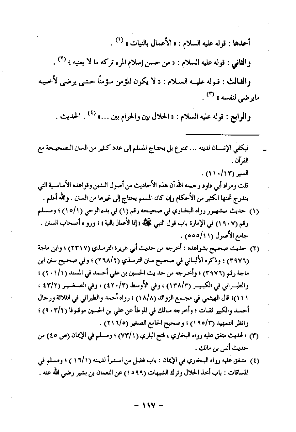 قلت ومراد أبي داود رحمه اللَّه أن هذه الأحاديث من أصول الدين وقواعده الأساسية التي يندرج تحتها الكثير من الأحكام وإن كان المسلم يحتاج إلى غيرها من السنن. واللَّه أعلم.