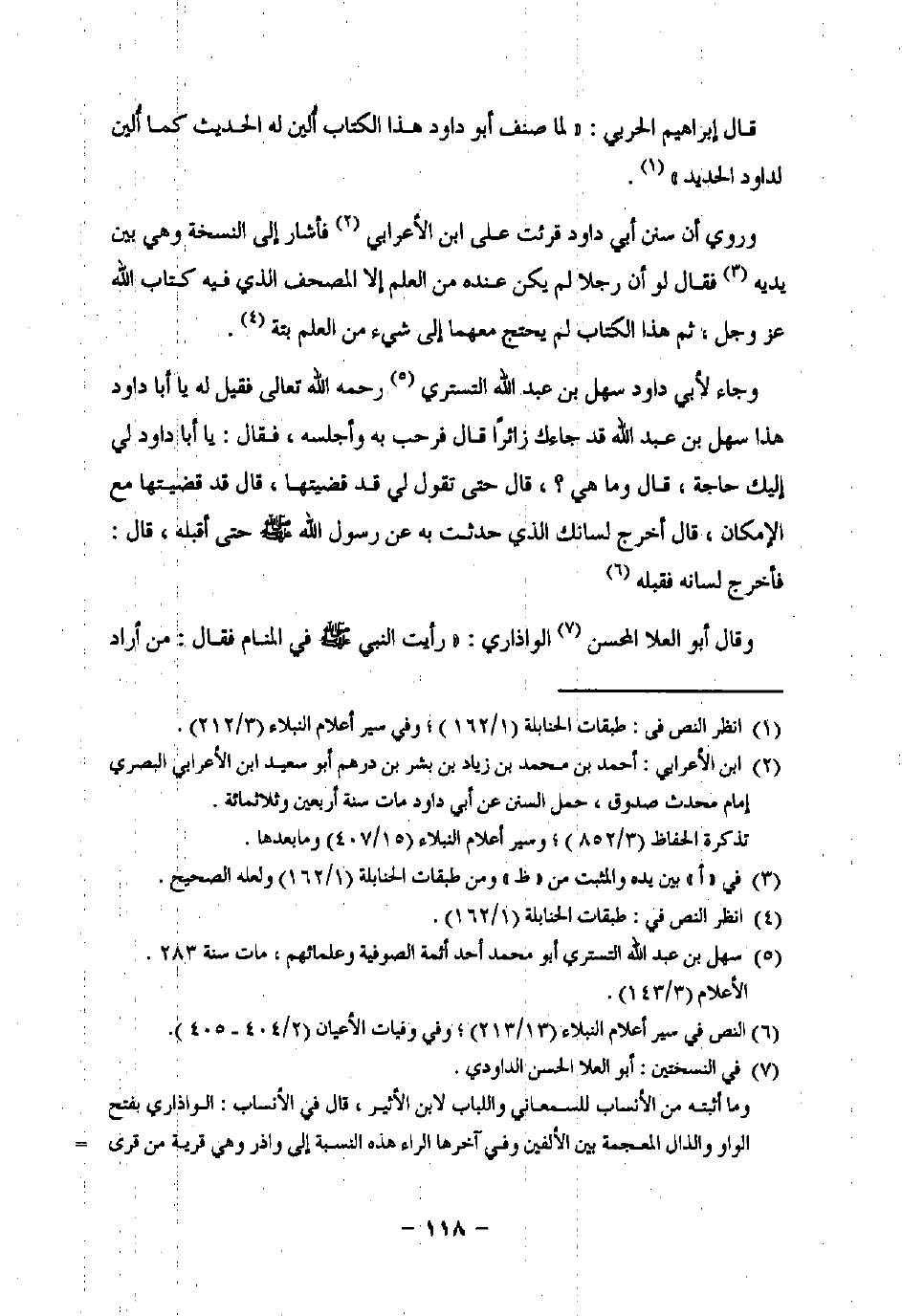 وجاء لأبي داود سهل بن عبد اللَّه التستري (¬5) رحمه اللَّه تعالى فقيل له يا أبا داود هذا سهل بن عبد اللَّه قد جاءك زائرًا قال فرحب به وأجلسه، فقال: يا أبا داود لي إليك حاجة، قال وما هي؟، قال حتى تقول لي قد قضيتها، قال قد قضيتها مع الإمكان، قال أخرج لسانك الذي حدثت به عن رسول اللَّه -صلى اللَّه عليه وسلم- حتى أقبله، قال: فأخرج لسانه فقبله (¬6).