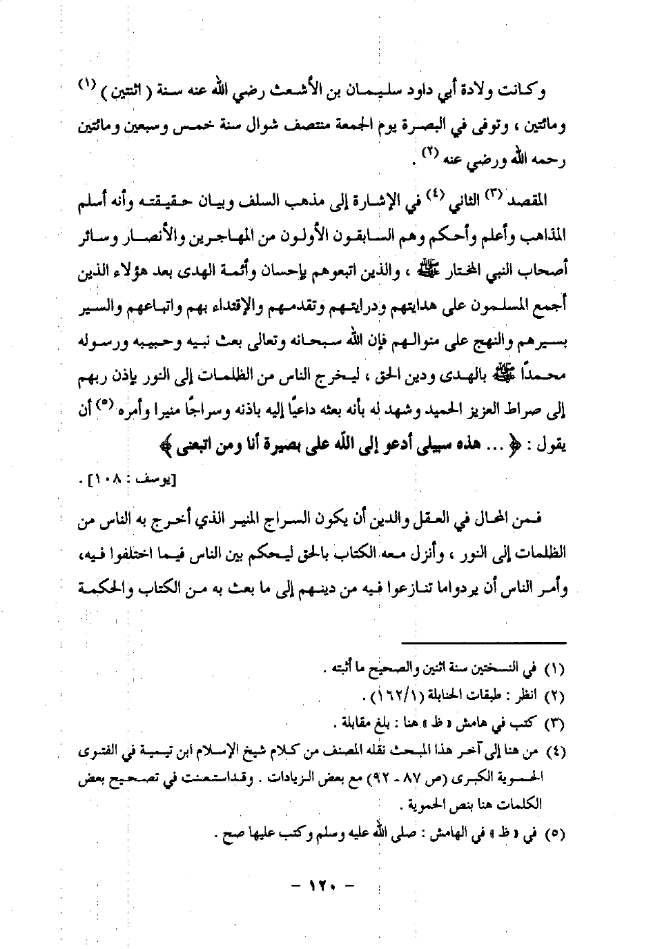 المقصد (¬3) الثاني (¬4): في الإشارة إلى مذهب السلف وبيان حقيقته وأنه أسلم المذاهب وأعلم وأحكم وهم السابقون الأولون من المهاجرين والأنصار وسائر أصحاب النبي المختار -صلى اللَّه عليه وسلم-، والذين اتبعوهم بإحسان وأئمة الهدى بعد هؤلاء الذين أجمع المسلمون على هدايتهم ودرايتهم وتقدمهم والإقتداء بهم واتباعهم والسير بسيرهم والنهج على منوالهم فإن اللَّه سبحانه وتعالى بعث نبيه وحبيبه ورسوله محمدًا -صلى اللَّه عليه وسلم- بالهدى ودين الحق، ليخرج الناس من الظلمات إلى النور بإذن ربهم إلى صراط العزيز الحميد وشهد له بأنه بعثه داعيًا إليه بإذنه وسراجًا منيرًا وأمره (¬5) أن يقول: {. . . قُلْ هَذِهِ سَبِيلِي أَدْعُو إِلَى اللَّهِ عَلَى بَصِيرَةٍ أَنَا وَمَنِ اتَّبَعَنِي} [يوسف: 108].