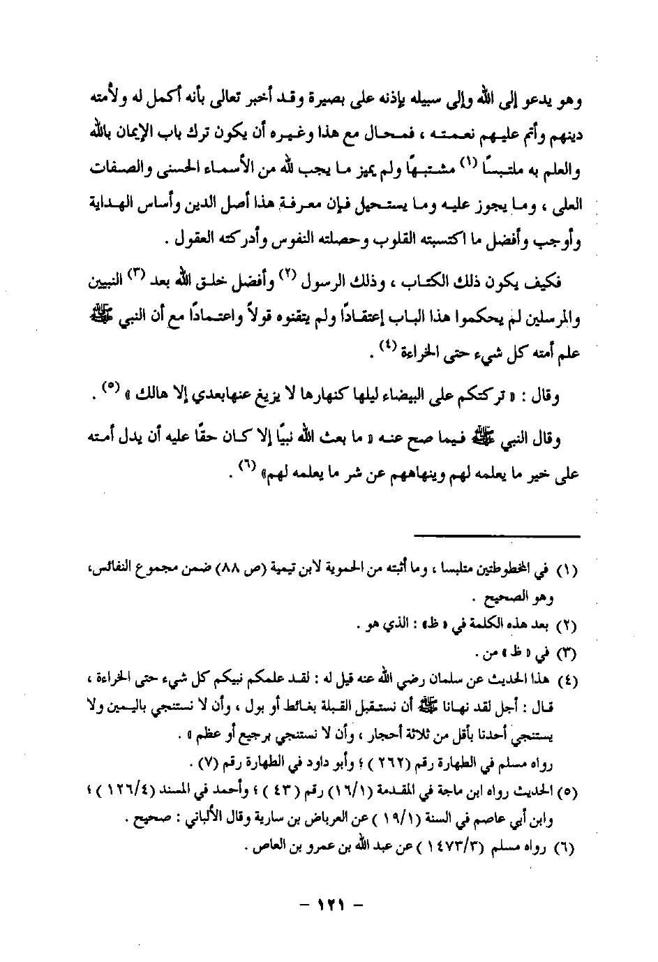 فكيف يكون ذلك الكتاب، وذلك الرسول (¬2) وأفضل خلق اللَّه بعد (¬3) النبيين والمرسلين لم يحكموا هذا الباب إعتقادًا ولم يتقنوه قولًا واعتمادًا مع أن النبي -صلى اللَّه عليه وسلم- علم أمته كل شيء حتى الخراءة (¬4).