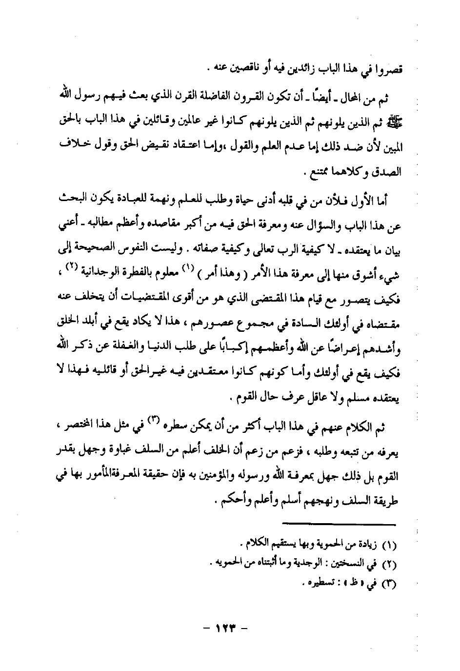 أما الأول فلأن من في قلبه أدنى حياة وطلب للعلم ونهمة للعبادة يكون البحث عن هذا الباب والسؤال عنه ومعرفة الحق فيه من أكبر مقاصده وأعظم مطالبه -أعني بيان ما يعتقده- لا كيفية الرب تعالى وكيفية صفاته. وليست النفوس الصحيحة إلى شيء أشوق منها إلى معرفة هذا الأمر (وهذا أمر) (¬1) معلوم بالفطرة الوجدانية (¬2)، فكيف يتصور مع قيام هذا المقتضى الذي هو من أقوى المقتضيات أن يتخلف عنه مقتضاه في أولئك السادة في مجموع عصورهم، هذا لا يكاد يقع في أبلد الخلق وأشدهم إعراضًا عن اللَّه وأعظمهم إكبابًا على طلب الدنيا والغفلة عن ذكر اللَّه فكيف يقع في أولئك وأما كونهم كانوا معتقدين فيه غير الحق أو قائليه فهذا لا يعتقده مسلم ولا عاقل عرف حال القوم.
