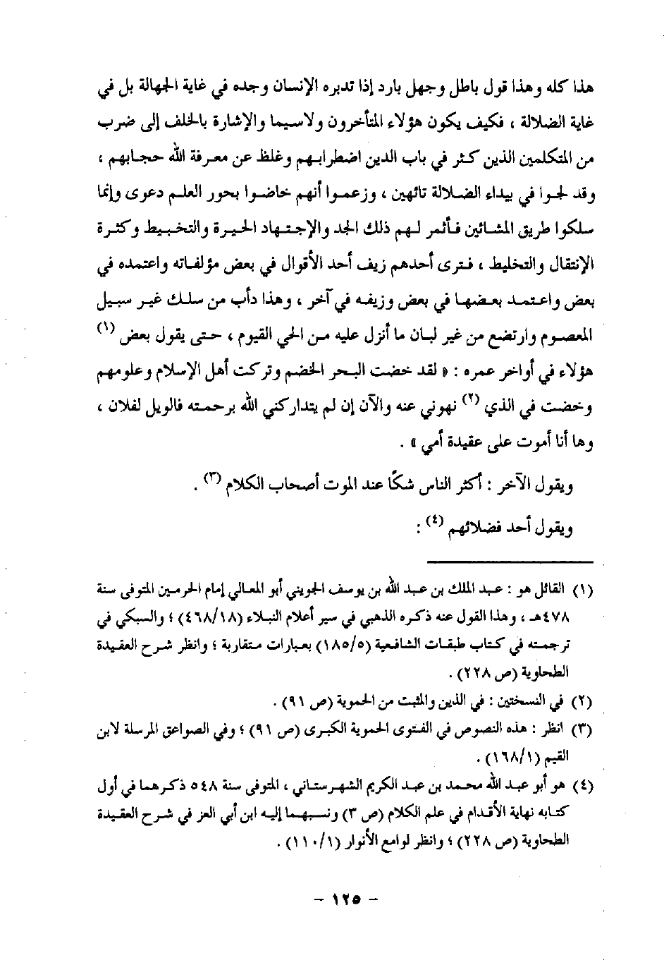 (¬1) القائل هو: عبد الملك بن عبد اللَّه بن يوسف الجويني أبو المعالي إمام الحرمين المتوفى سنة 478 هـ، وهذا القول عنه ذكره الذهبي في سير أعلام النبلاء (18/ 468)؛ والسبكي في ترجمته في كتاب طبقات الشافعية (5/ 185) بعبارات متقاربة؛ وانظر شرح العقيدة الطحاوية (ص 228).