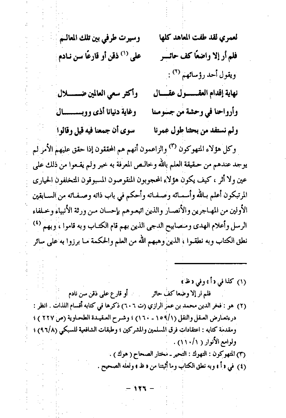 (¬2) هو: فخر الدين محمد بن عمر الرازي (ت 606) ذكرها في كتابه أقسام اللذات. انظر: درء تعارض العقل ونقل (1/ 159 - 160)، وشرح العقيدة الطحاوية (ص 227)؛ ومقدمة كتابه: اعتقادات فرق المسلمين والمشركين؛ وطبقات الشافعية للسبكي (8/ 96)؛ ولوامع الأنوار (1/ 110).