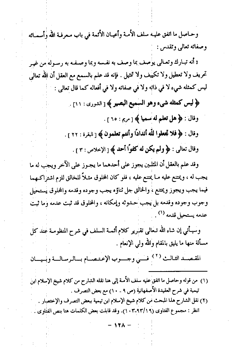 (¬1) من قوله وحاصل ما اتفق عليه سلف الأمة إلى هنا نقله الشارح من كلام شيخ الإسلام ابن تيمية في شرح العقيدة الأصفهانية (ص 9 - 10) مع بعض التصرف.