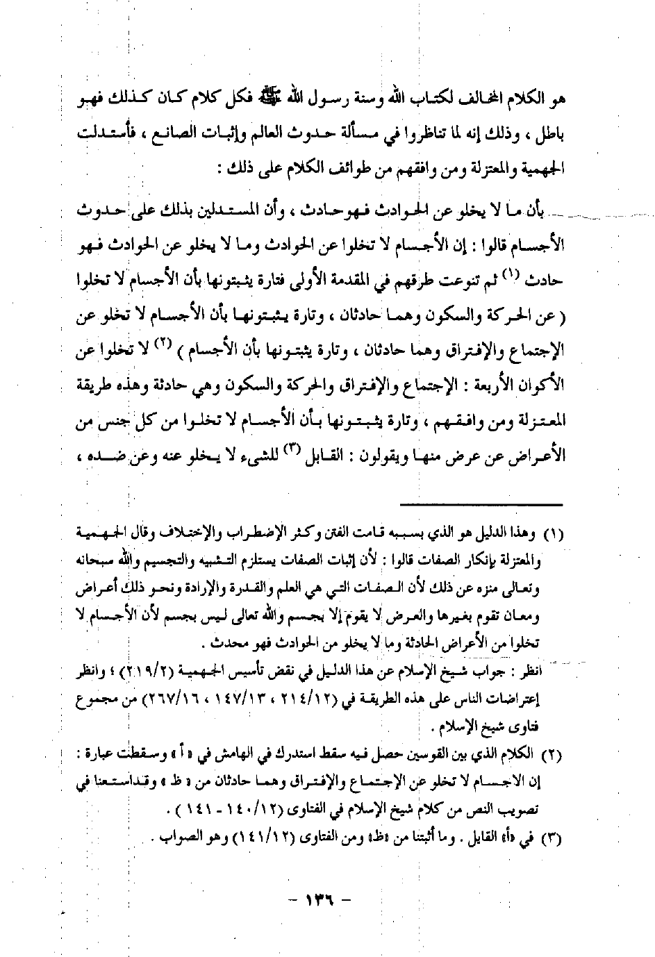 (¬1) وهذا الدليل هو الذي يسببه قامت الفتن وكثر الإضطراب والإختلاف وقال الجهمية والمعتزلة بإنكار الصفات قالوا: لأن إثبات الصفات يستلزم التشبيه والتجسيم واللَّه سبحانه وتعالى منزه عن ذلك لأن الصفات التي هي العلم والقدرة والإرادة ونحو ذلك أعراض ومعان تقوم بغيرها والعرض لا يقوم إلا بجسم واللَّه تعالى ليس بجسم لأن الأجسام لا تخلوا من الأعراض الحادثة وما لا يخلو من الحوادث فهو محدث.