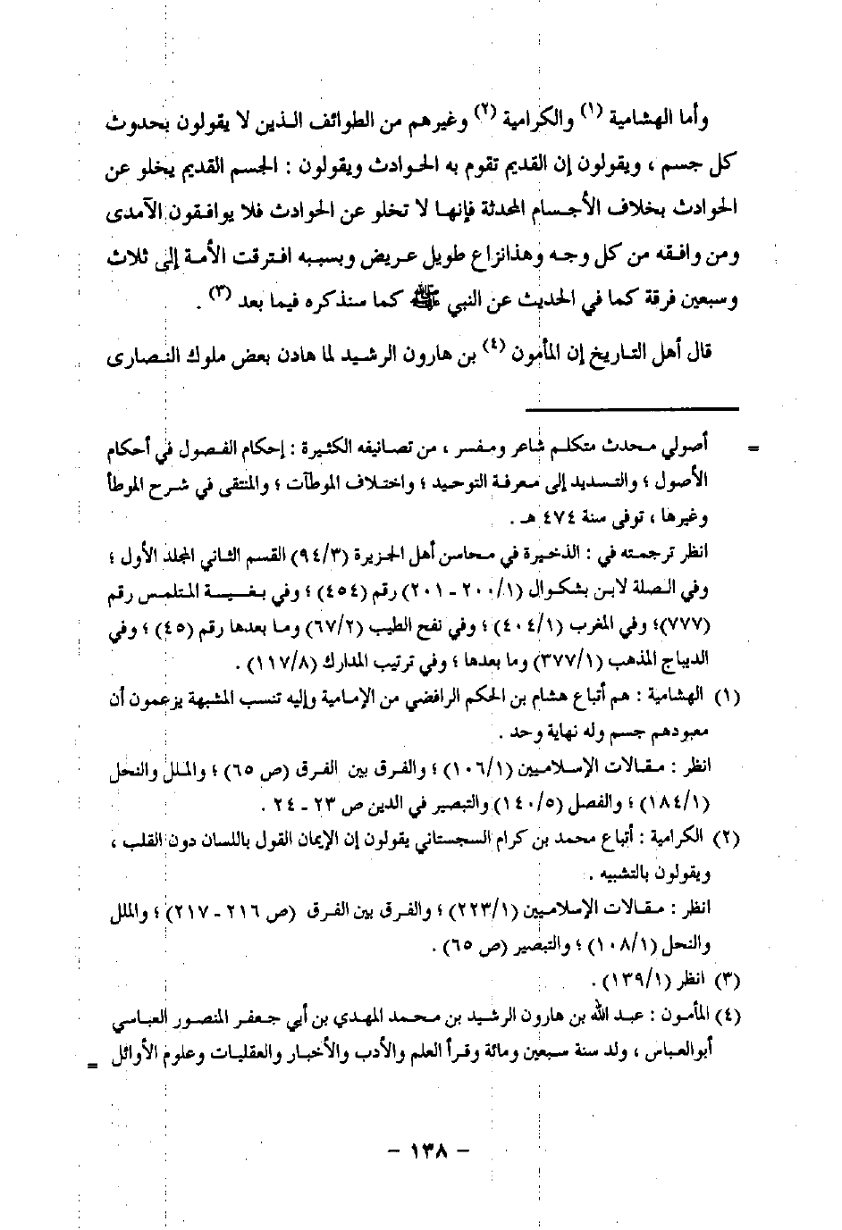 (¬1) الهشامية: هم أتباع هشام بن الحكم الرافضي من الإمامية وإليه تنسب المشبهة يزعمون أن معبودهم جسم وله نهاية واحد.