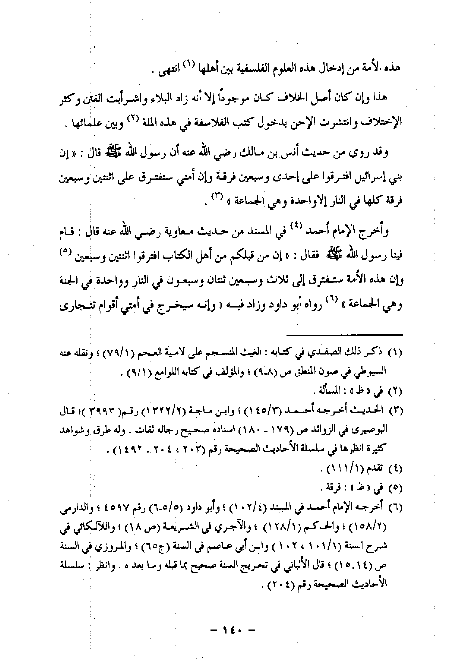 (¬6) أخرجه الإمام أحمد في المسند (4/ 102)؛ وأبو داود (5/ 5 - 6) رقم 4597؛ والدارمي (2/ 158)؛ والحاكم (1/ 128)؛ والآجري في الشريعة (ص 18)؛ واللآلكائي في شرح السنة (1/ 101، 102) وابن أبي عاصم في السنة (ج 65)؛ والمروزي في السنة ص (14، 15)؛ قال الألباني في تخريج السنة صحيح بما قبله وما بعده. وانظر: سلسلة الأحاديث الصحيحة رقم (204).