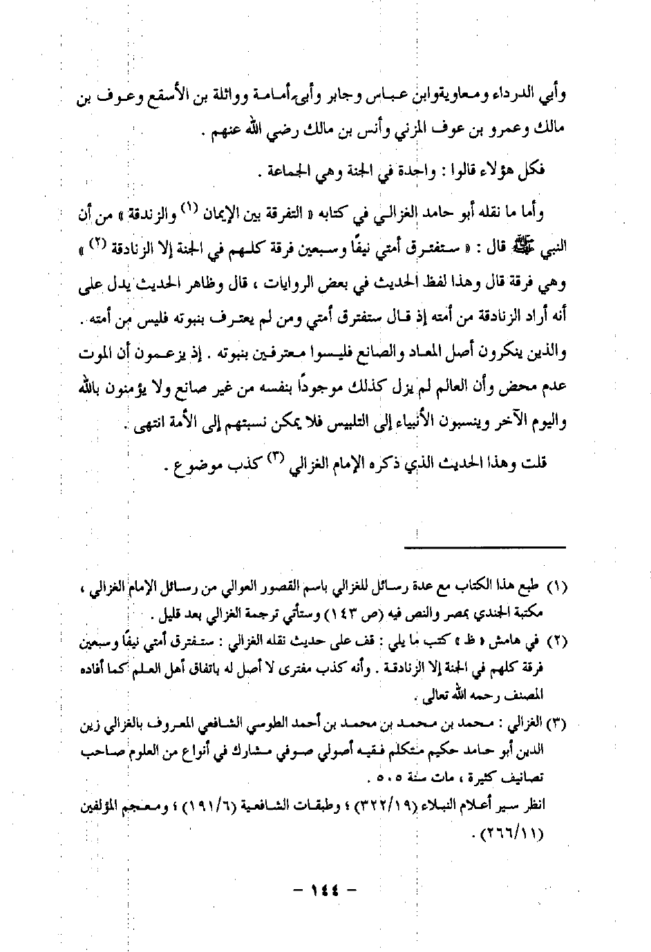 وأما ما نقله أبو حامد الغزالي في كتابه "الفرقة بين الإيمان (¬1) والزندقة" من أن النبي -صلى اللَّه عليه وسلم- قال: "ستفترق أمتي نيفًا وسبعين فرقة كلهم في الجنة إلا الزنادقة (¬2) " وهي فرقة قال وهذا لفظ الحديث في بعض الروايات، قال وظاهر الحديث يدل على أنه أراد الزنادقة من أمته إذ قال ستفترق أمتي ومن لم يعترف بنبوته فليس من أمته. والذين ينكرون أصل المعاد والصانع فليسوا معترفين بنبوته. إذ يزعمون أن الموت عدم محض وأن العالم لم يزل كذلك موجودًا بنفسه من غير صانع ولا يؤمنون باللَّه واليوم الآخر وينسبون الأنبياء إلى التلبيس فلا يمكن نسبتهم إلى الأمة انتهى.