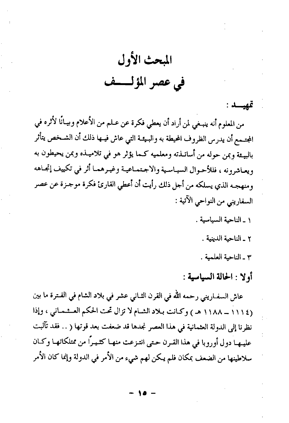 من المعلوم أنه ينبغي لمن أراد أن يعطي فكرة عن علم من الأعلام وبيانًا لأثره في المجتمع أن يدرس الظروف المحيطة به والبيئة التي عاش فيها ذلك أن الشخص يتأثر بالبيئة وبمن حوله من أساتذته ومعلميه كما يؤثر هو في تلاميذه وبمن يحيطون به ويعاشرونه، فللأحوال السياسية والاجتماعية وغيرهما أثر في تكييف إتجاهه ومنهجه الذي يسلكه من أجل ذلك رأيت أن أعطي القارئ فكرة موجزة عن عصر السفاريني من النواحي الآتية: