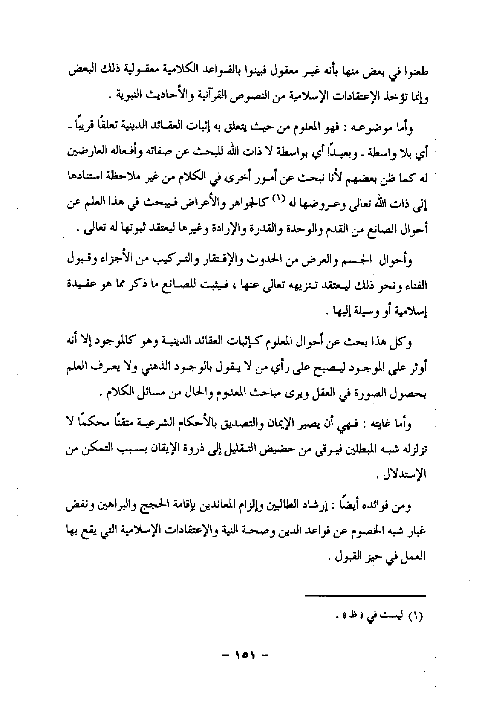 وأما موضوعه: فهو المعلوم من حيث يتعلق به إثبات العقائد الدينية تعلقًا قريبًا -أي بلا واسطة- وبعيدًا أي بواسطة لا ذات اللَّه للبحث عن صفاته وأفعاله العارضين له كما ظن بعضهم لأنا نبحث عن أمور أخرى في الكلام من غير ملاحظة استنادها الى ذات اللَّه تعالى وعروضها له (¬1) كالجواهر والأعراض فيبحث في هذا العلم عن أحوال الصانع من القدم والوحدة والقدرة والإرادة وغيرها ليعتقد ثبوتها له تعالى.