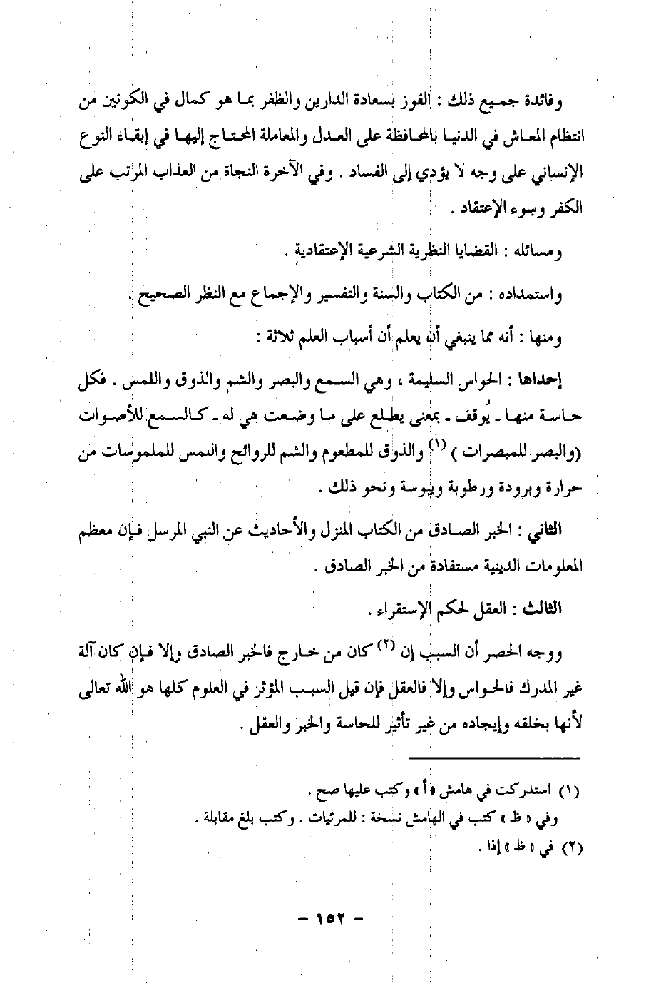 إحداها: الحواس السليمة، وهي السمع والبصر والشم والذوق واللمس. فكل حاسة منها -يُوقف- بمعنى يطلع على ما وضحت هي له- كالسمع للأصوات (والبصر للمبصرات) (¬1) والذوق للمطعوم والشم للروائح واللمس للملموسات من حرارة وبرودة ورطوية ويبوسة ونحو ذلك.
