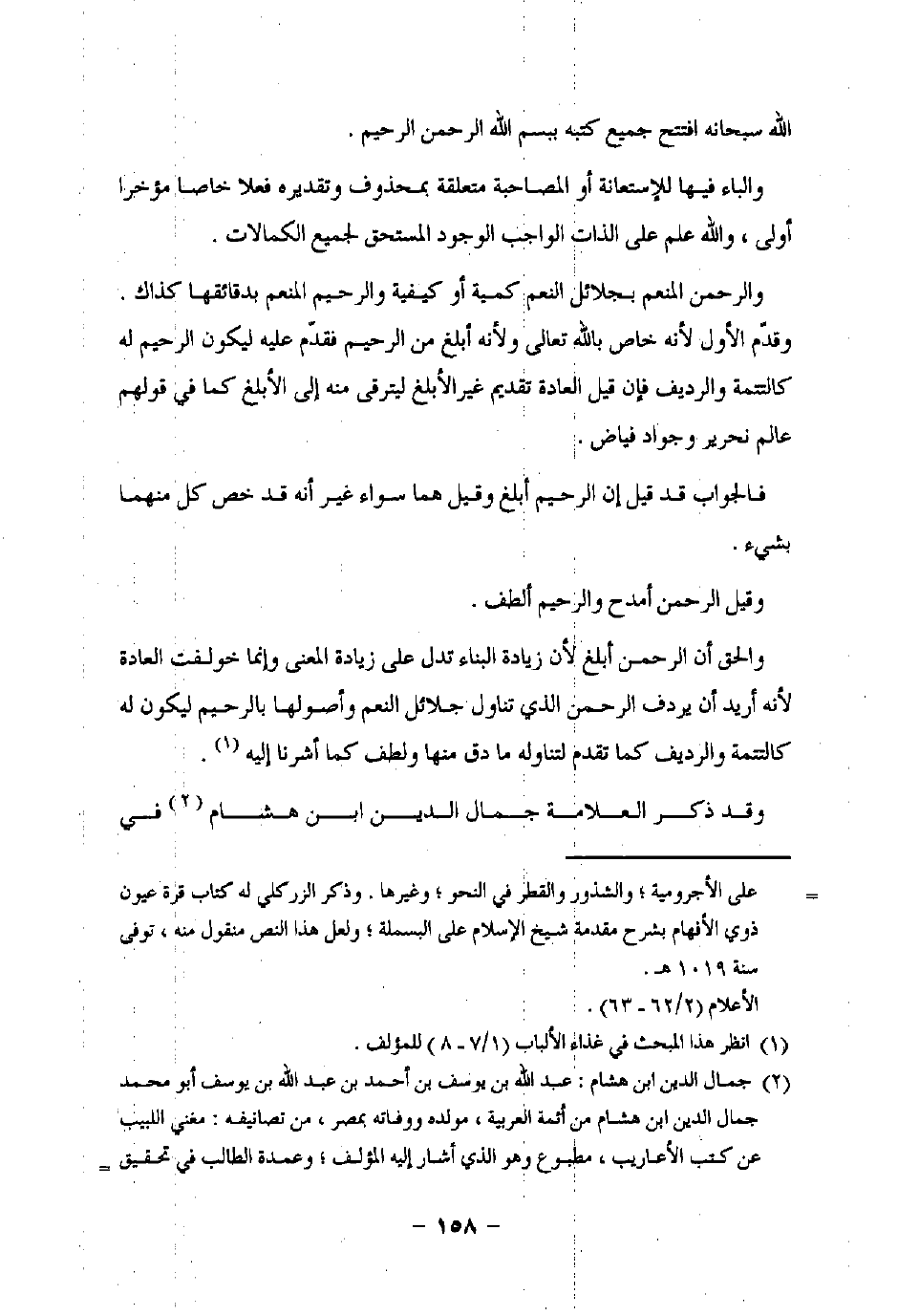 = على الأجرومية؛ والشذور والقطر في النحو؛ وغيرها. وذكر الزركلي له كتاب قرة عيون ذوي الأفهام بشرح مقدمة شيخ الإسلام على البسملة؛ ولعل هذا النص منقول منه، توفى سنه 1019 هـ.