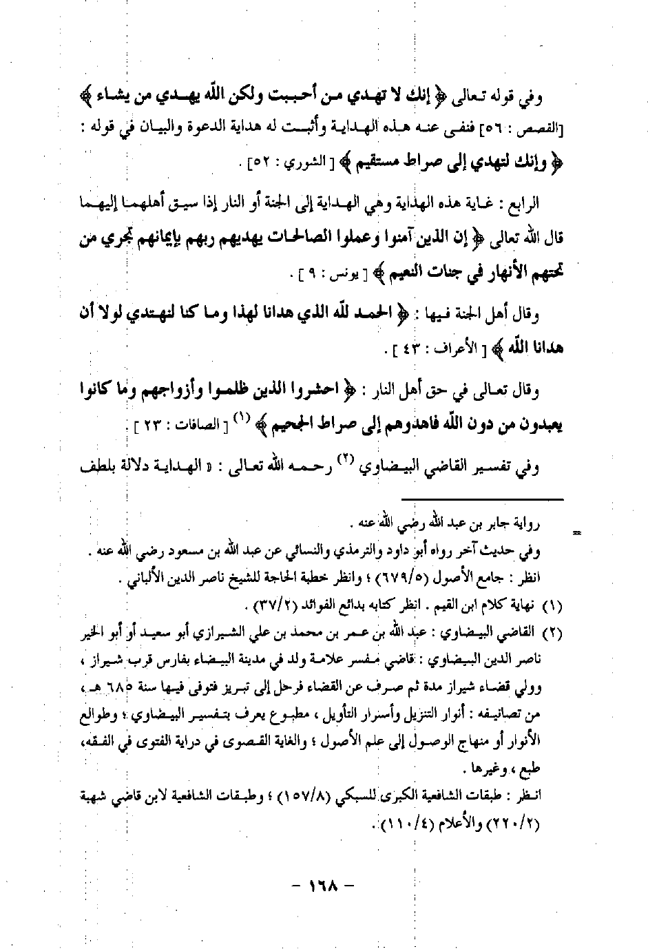 (¬2) القاضي البيضاوي: عبد اللَّه بن عمر بن محمد بن علي الشيرازي أبو سعيد أو أبو الخير ناصر الدين البيضاوي: قاضي مفسر علامة ولد في مدينة البيضاء بفارس قرب شيراز، وولي قضاء شيراز مدة صرف عن القضاء فرحل إلى تبريز فتوفى فيها سنة 685 هـ، من تصانيفه: أنوار التنزيل وأسرار التأويل، مطبوع يعرف بتفسير البيضاوي؛ وطوالع الأنوار أو منهاج الوصول إلى علم الأصول، والغاية القصوى في دراية الفتوى في الفقه، طبع، وغيرها.