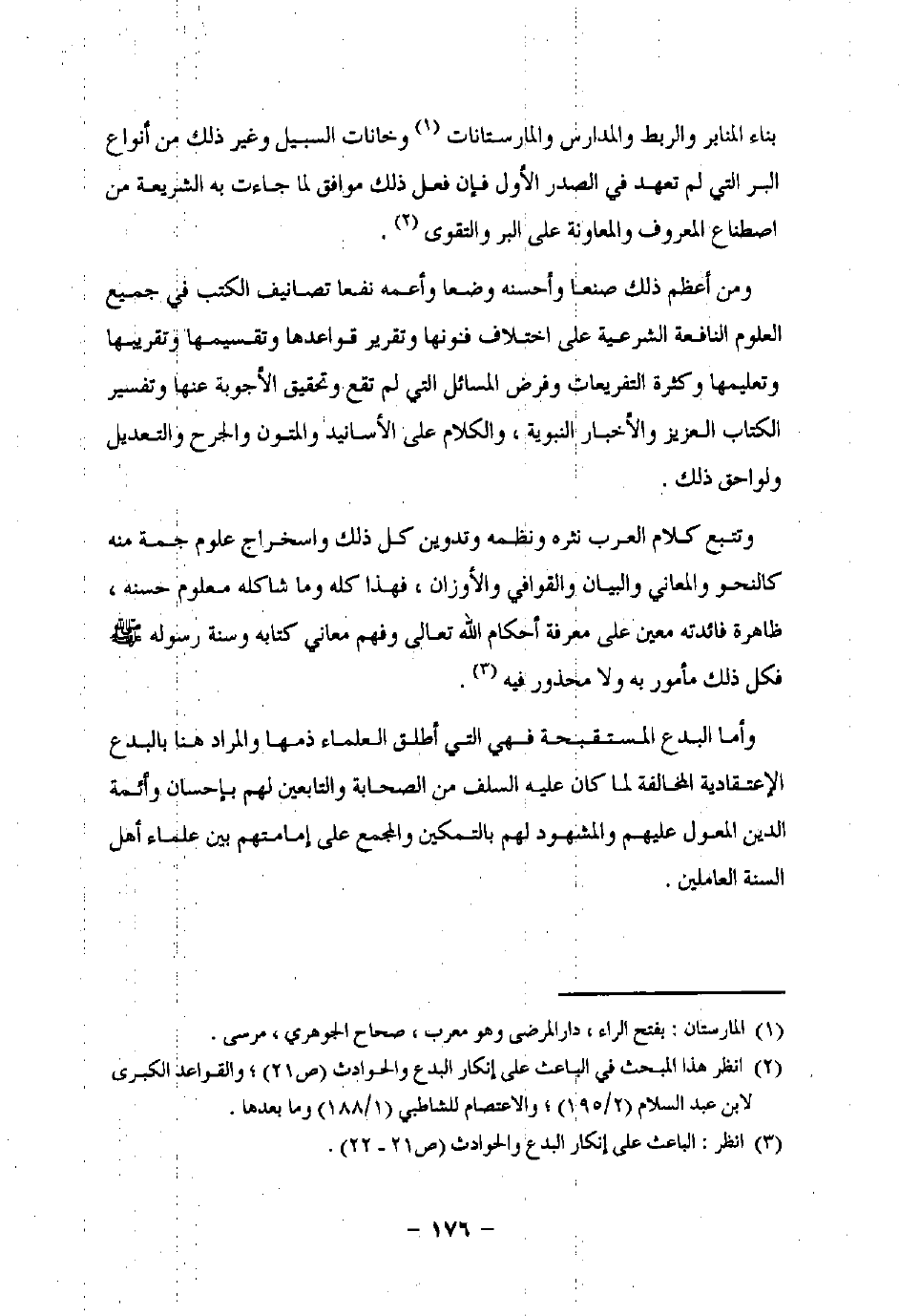 ومن أعظم ذلك صنعا وأحسنه وضعا وأعمه نفعا تصانيف الكتب فى جميع العلوم النافعة الشرعية على اختلاف فنونها وتقرير قواعدها وتقسيمها وتقريبها وتعليمها وكثرة التفريعات وفرض المسائل التي لم تقع وتحقيق الأجوبة عنها وتفسير الكتاب العزيز والأخبار النبوية، والكلام على الأسانيد والمتون والجرح والتعديل ولواحق ذلك.