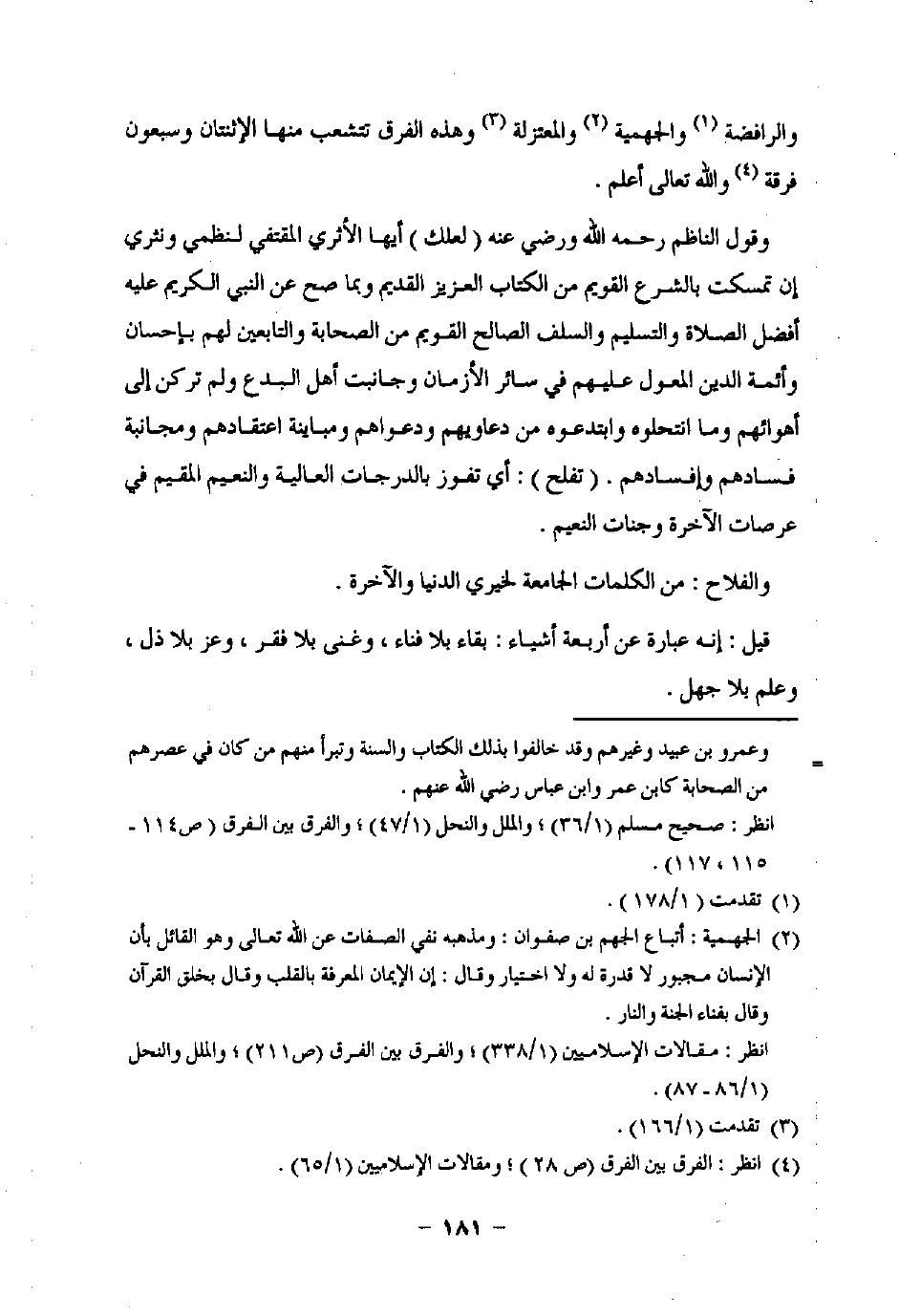 وقول الناظم رحمه اللَّه ورضي عنه (لعلك) أيها الأثري المقتفي لنظمي ونثري إن تمسكت كالشرع القويم من الكتاب العزيز القديم وبما صح عن النبي الكريم عليه أفضل الصلاة والتسليم والسلف الصالح القويم من الصحابة والتابعين لهم بإحسان وأئمة الدين المعول عليهم في سائر الأزمان وجانبت أهل البدع ولم تركن إلى أهوائهم وما انتحلوه وابتدعوه من دعاويهم ودعواهم ومباينة اعتقادهم ومجانبة فسادهم وإفسادهم. (تفلح): أي تفوز بالدرجات العالية والنعيم المقيم في عرصات الآخرة وجنات النعيم.