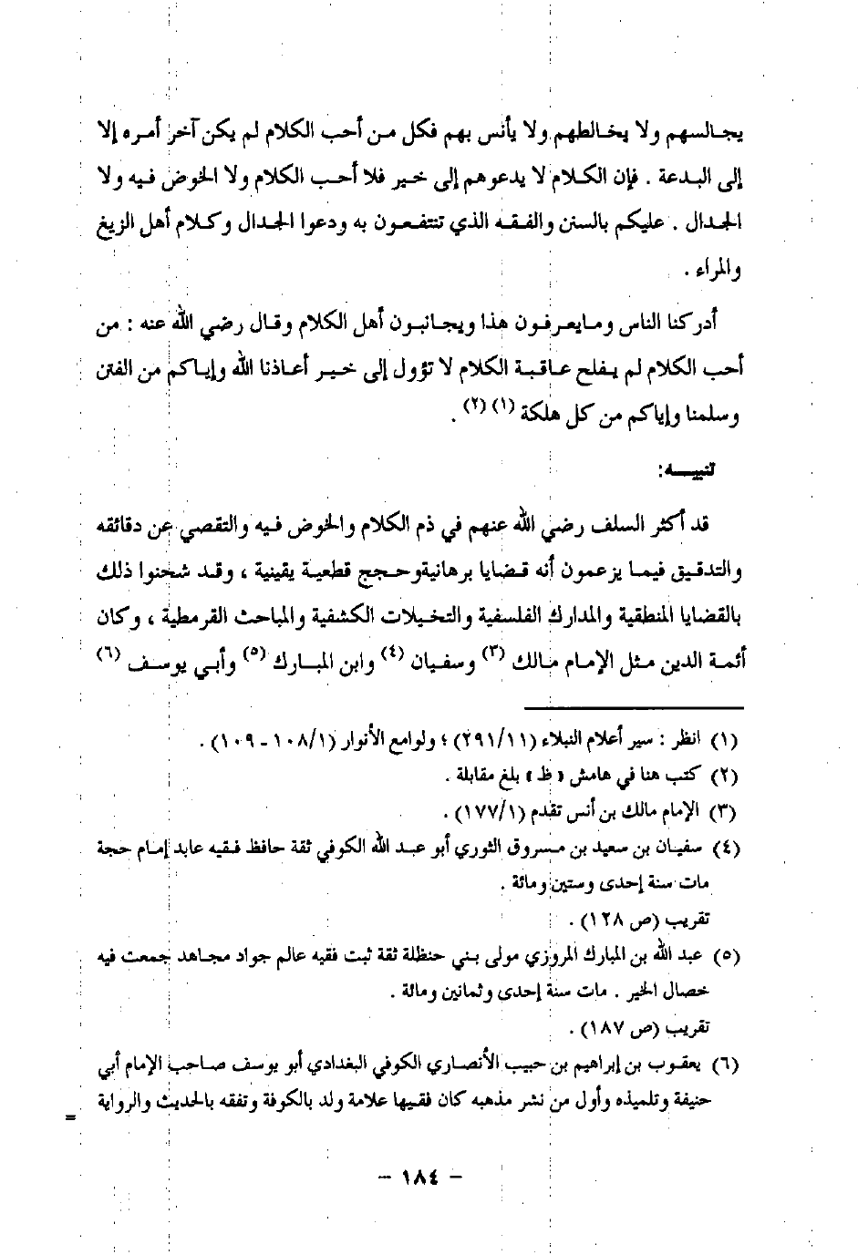 قد أكثر السلف رضي اللَّه عنهم في ذم الكلام والخوض فيه والتقصي عن دقائقه والتدقيق فيما يزعمون أنه قضايا برهانية وحجج قطعية يقينية، وقد شحنوا ذلك بالقضايا المنطقية والمدارك الفلسفية والتخيلات الكشفية والمباحث القرمطية، وكان أئمة الدين مثل الإمام مالك (¬3) وسفيان (¬4) وابن المبارك (¬5) وأبى يوسف (¬6)