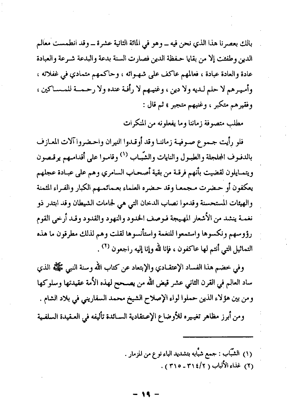 فلو رأيت جموع صوفية زماننا وقد أوقدوا النيران واحضروا آلات المعازف بالدفوف المجلجلة والطبول والنايات والشّباب (¬1) وقاموا على أقدامهم يرقصون ويتمايلون لقضيت بأنهم فرقة من بقية أصحاب السامري وهم على عبادة عجلهم يعكفون أو حضرت مجمعا وقد حضره العلماء بعمائمهم الكبار والفراء المثمنة والهيئات المستحسنة وقدموا نصاب الدخان التي هي لجامات الشيطان وقد ابتدر ذو نغمة ينشد من الأشعار المهيجة فوصف الخدود والنهود والقدود وقد أرخى القوم رؤوسهم ونكسوها واستمعوا للنغمة واستأنسوها لقلت وهم لذلك مطرقون ما هذه التماثيل التي أنتم لها عاكفون، فإنا للَّه وإنا إليه راجعون (¬2).