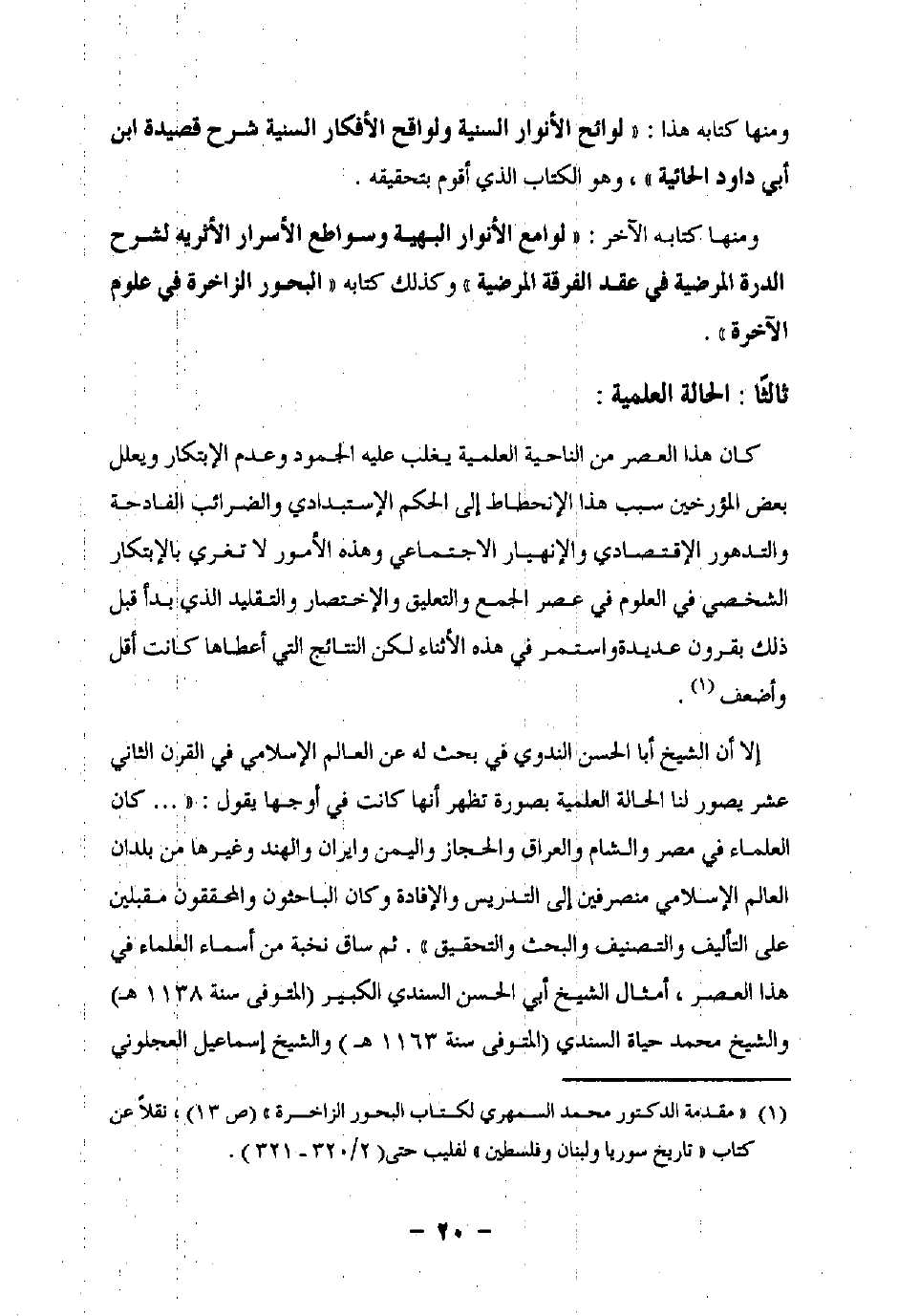 إلا أن الشيخ أبا الحسن الندوي في بحث له عن العالم الإِسلامي في القرن الثاني عشر يصور لنا الحالة العلمية بصورة تظهر أنها كانت في أوجها يقول: ". . . كان العلماء في مصر والشام والعراق والحجاز واليمن وإيران والهند وغيرها من بلدان العالم الإِسلامي منصرفين إلى التدريس والإفادة وكان الباحثون والمحققون مقبلين على التألف والتصنيف والبحث والتحقيق". ثم ساق نخبة من أسماء العلماء في هذا العصر، أمثال الشيخ أبي الحسن السندي الكبير (المتوفى سنة 1138 هـ) والشيخ محمد حياة السندي (المتوفى سنة 1163 هـ) والشيخ إسماعيل العجلوني