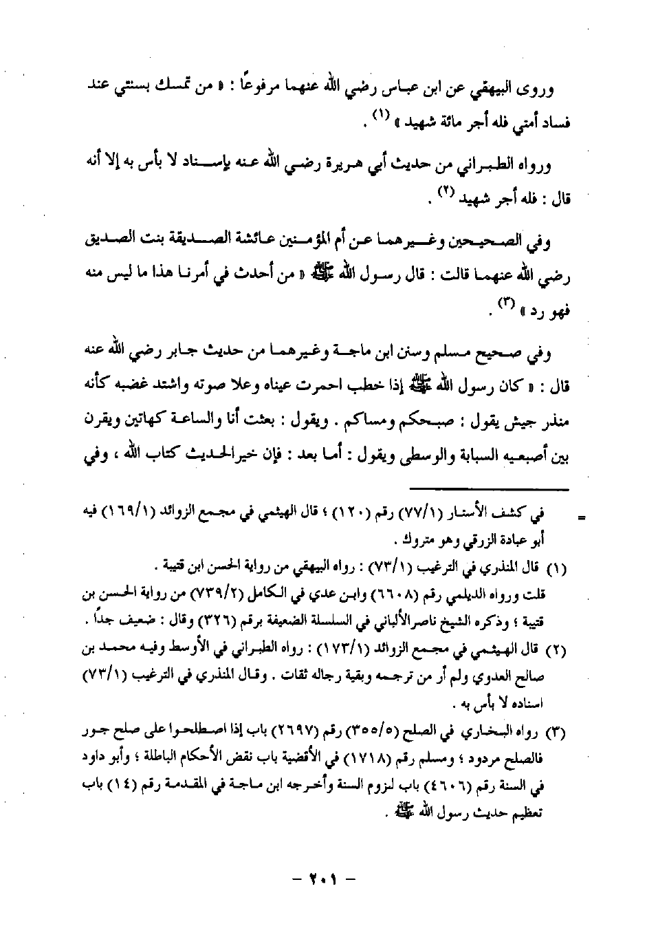 (¬3) رواه البخاري في الصلح (5/ 355) رقم (2697) باب إذا إصطلحوا على صلح جور فالصلح مردود؛ ومسلم رقم (1718) في الأقضية باب نقض الأحكام الباطلة؛ وأبو داود في السنة رقم (4606) باب لزوم السنة وأخرجه ابن ماجة في المقدمة رقم (14) باب تعظيم حديث رسول اللَّه -صلى اللَّه عليه وسلم-.