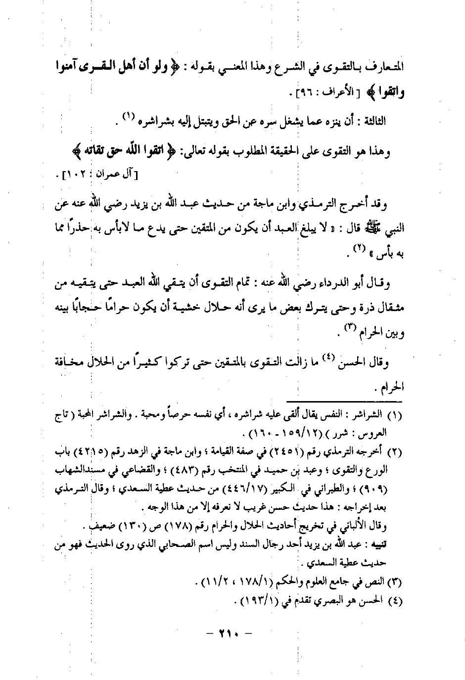 (¬2) أخرجه الترمذي رقم (2451) في صفة القيامة، وابن ماجة في الزهد رقم (4215) باب الورع والتقوى؛ وعبد بن حميد في المنتخب رقم (483)؛ والقضاعي في مسند الشهاب (909)، والطبراني في الكبير (17/ 446) من حديث عطية السعدي؛ وقال الترمذي بعد إخراجه: هذا حديث حسن غريب لا نعرفه إلا من هذا الوجه.