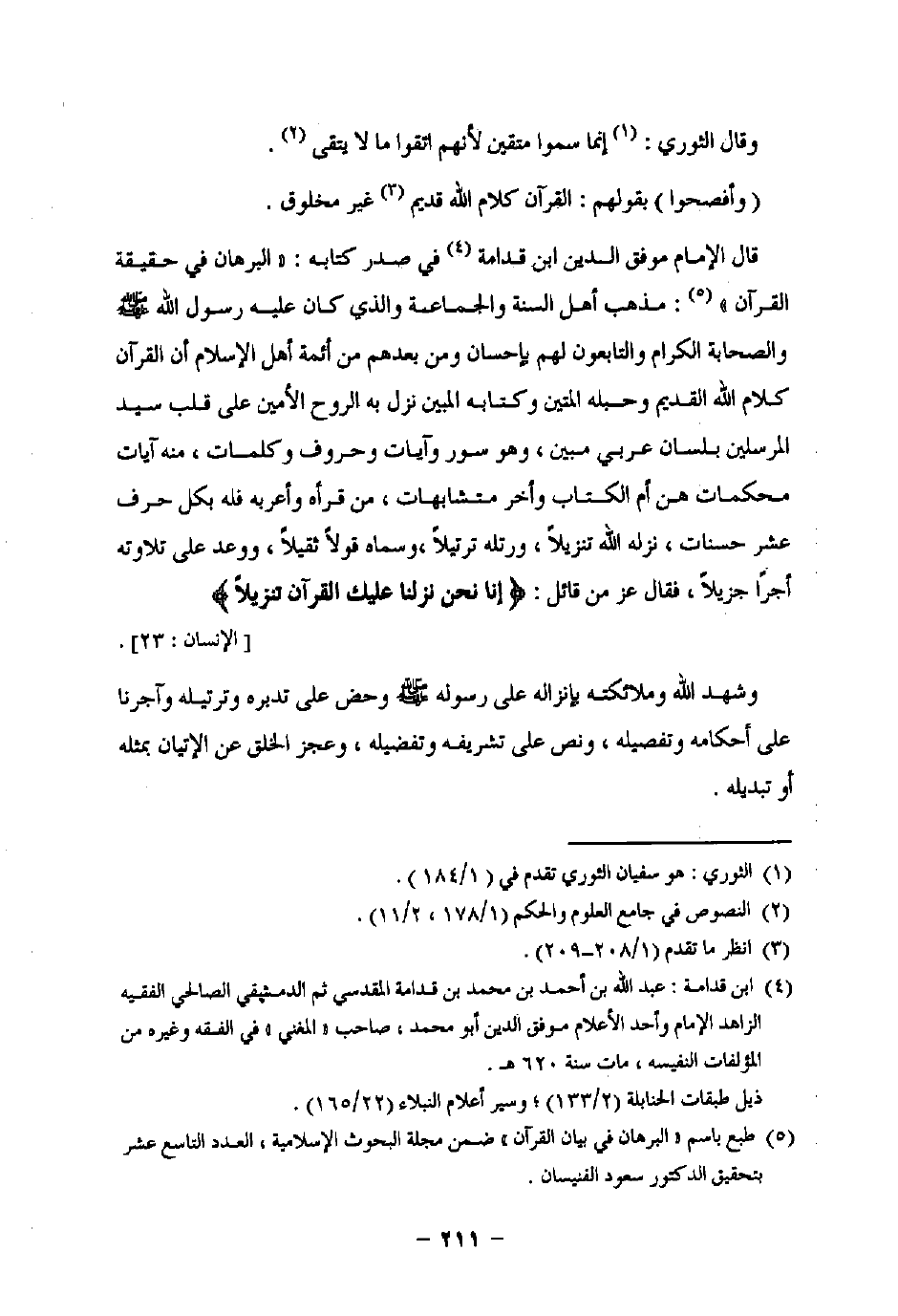 قال الإمام موفق الدين ابن قدامة (¬4) في صدر كتابه: "البرهان في حقيقة القرآن" (¬5): مذهب أهل السنة والجماعة والذي كان عليه رسول اللَّه -صلى اللَّه عليه وسلم- والصحابة الكرام والتابعون لهم بإحسان ومن بعدهم من أئمة أهل الإسلام أن القرآن كلام اللَّه القديم وحبله المتين وكتابه المبين نزل به الروح الأمين على قلب سيد المرسلين بلسان عربي مبين، وهو سور وآيات وحروف وكلمات، منه آيات محكمات هن أم الكتاب وأخر متشابهات، من قرأه وأعربه فله بكل حرف عشر حسنات، نزله اللَّه تنزيلًا، ورتله ترتيلًا، وسماه قولًا ثقيلًا، ووعد على تلاوته أجرًا جزيلًا، فقال عز من قائل: {إِنَّا نَحْنُ نَزَّلْنَا عَلَيْكَ الْقُرْآنَ تَنْزِيلًا} [الإنسان: 23].