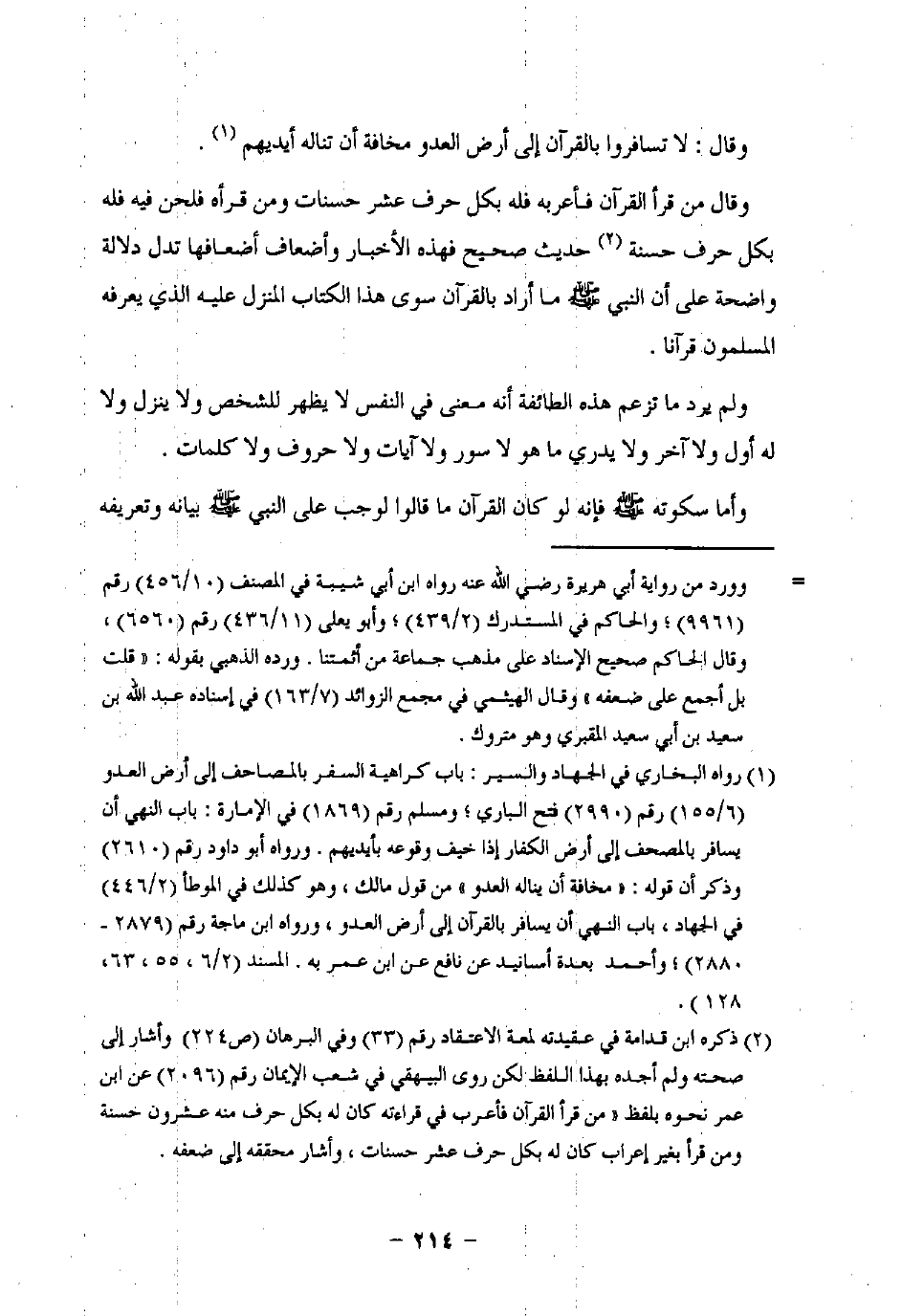 (¬2) ذكره ابن قدامة في عقيدته لمعة الاعتقاد رقم (33) وفي البرهان (ص 224) وأشار إلى صحته ولم أجده بهذا اللفظ لكن روى البيهقي في شعب الإيمان رقم (2096) عن ابن عمر نحوه بلفظ "من قرأ القرآن فأعرب في قراءته كان له بكل حرف منه عشرون حسنة ومن قرأ بغير إعراب كان له بكل حرف عشر حسنات، وأشار محققه إلى ضعفه.