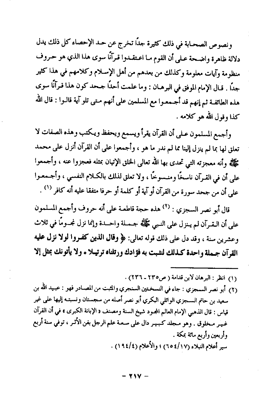 ونصوص الصحابة في ذلك كثيرة جدًّا تخرج عن حد الإحصاء كل ذلك يدل دلالة ظاهرة واضحة على أن القوم ما اعتقدوا قرآنًا سوى هذا الذي هو حروف منظومة وآيات معلومة وكذلك من بعدهم من أهل الإسلام وكلامهم في هذا كثير جدًّا. قال الإِمام الموفق في البرهان: وما علمت أحدًا جحد كون هذا قرآنًا سوى هذه الطائفة ثم إنهم قد أجمعوا مع المسلمين على أنهم متى تلو آية قالوا: قال اللَّه كذا وقول اللَّه هو كلامه.