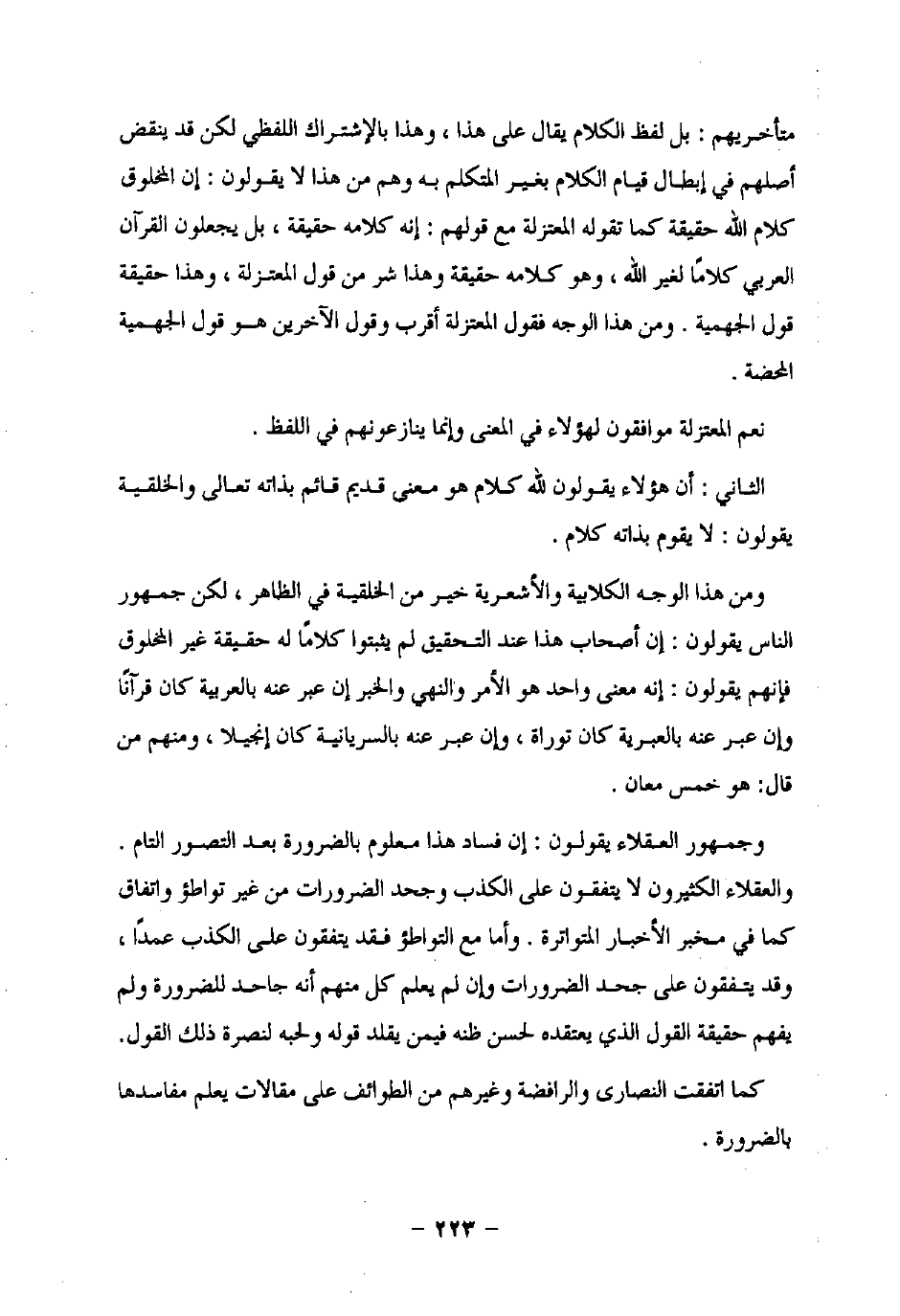 ومن هذا الوجه الكلابية والأشعرية خير من الخلقية في الظاهر، لكن جمهور الناس يقولون: إن أصحاب هذا عند التحقيق لم يثبتوا كلامًا له حقيقة غير المخلوق فإنهم يقولون: إنه معنى واحد هو الأمر والنهي والخبر إن عبر عنه بالعربية كان قرآنًا وإن عبر عنه بالعبرية كان توراة، وإن عبر عنه بالسريانية كان إنجيلا، ومنهم من قال: هو خمس معان.