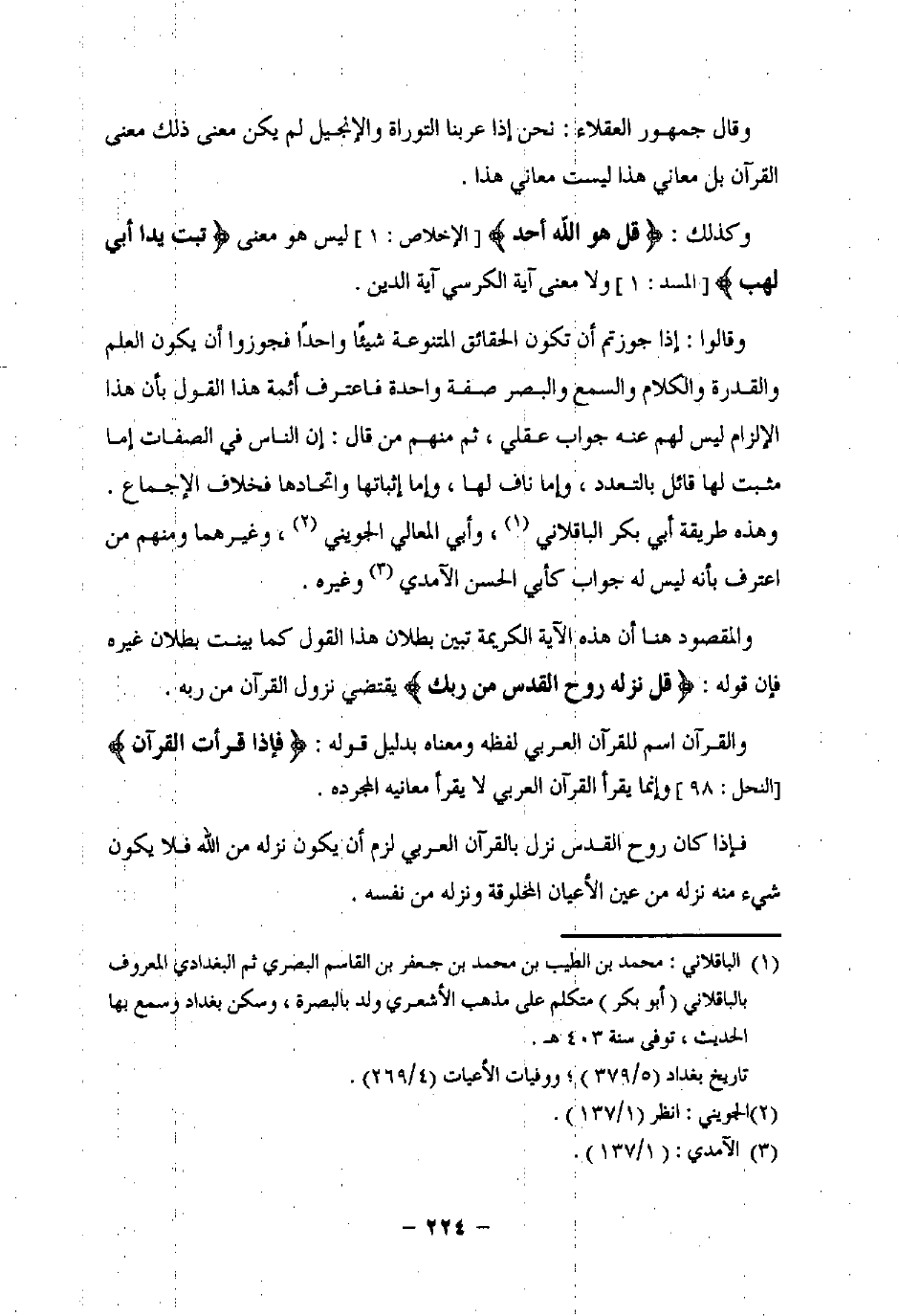 (¬1) الباقلاني: محمد بن الطيب بن محمد بن جعفر بن القاسم البصري ثم البغدادي المعروف بالباقلاني (أبو بكر) متكلم على مذهب الأشعري ولد بالبصرة، وسكن بغداد وسمع بها الحديث، توفى سنة 403 هـ.