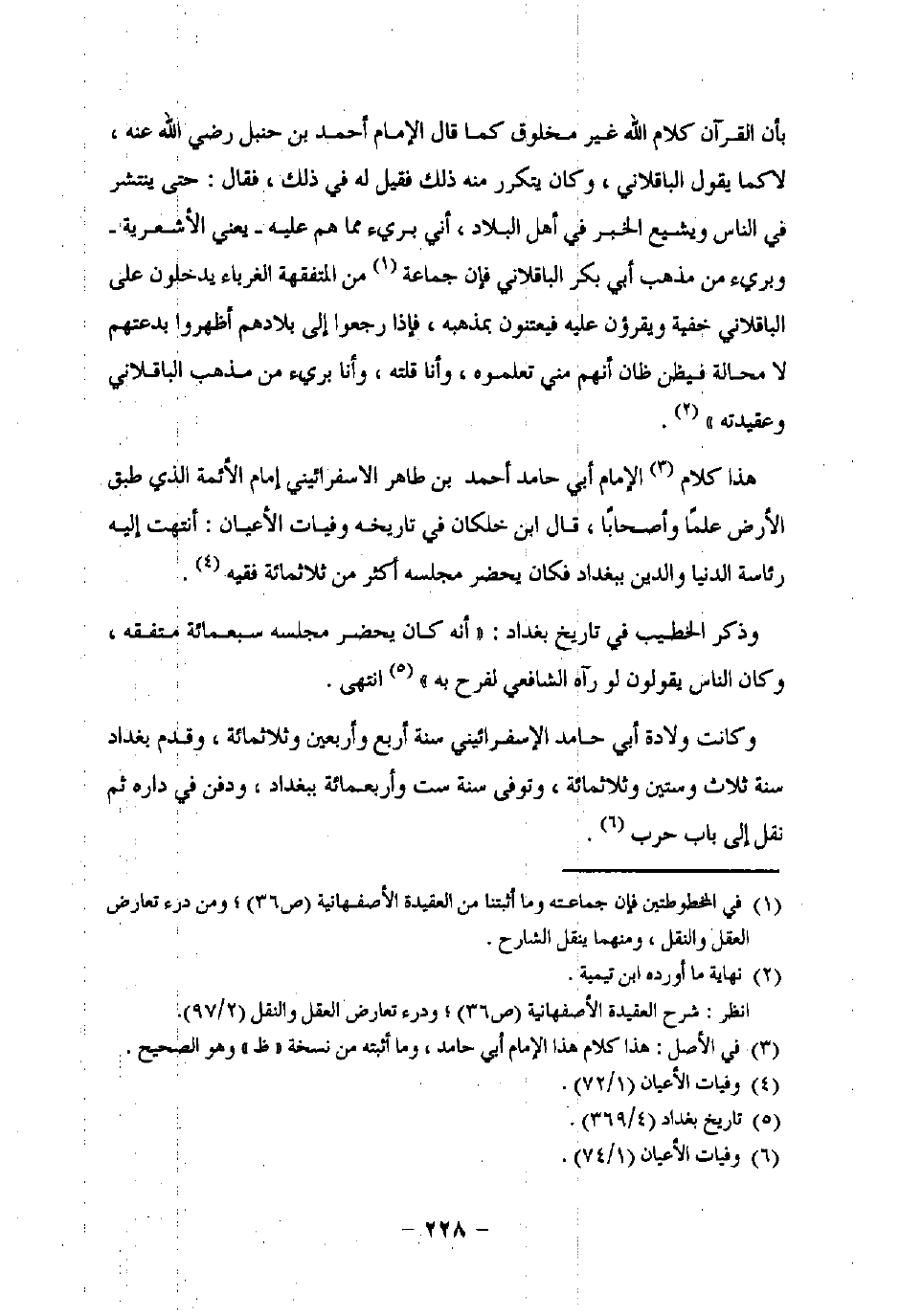هذا كلام (¬3) الإمام أبي حامد أحمد بن طاهر الاسفرائيني إمام الأئمة الذي طبق الأرض علمًا وأصحابًا، قال ابن خلكان في تاريخه وفيات الأعيان: أنتهت إليه رئاسة الدنيا والدين ببغداد فكان يحضر مجلسه أكثر من ثلاثمائة فقيه (¬4).