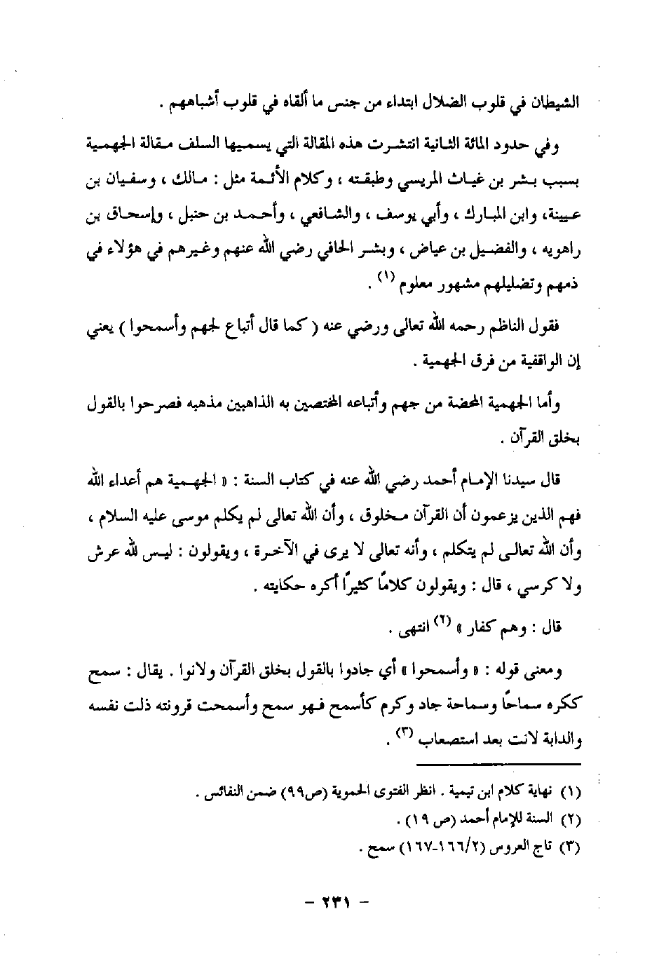 قال سيدنا الإمام أحمد رضي اللَّه عنه في كتاب السنة: "الجهمية هم أعداء اللَّه فهم الذين يزعمون أن القرآن مخلوق، وأن اللَّه تعالى لم يكلم موسى عليه السلام، وأن اللَّه تعالى لم يتكلم، وأنه تعالى لا يرى في الآخرة، ويقولون: ليس للَّه عرش ولا كرسي، قال: ويقولون كلامًا كثيرًا أكره حكايته.