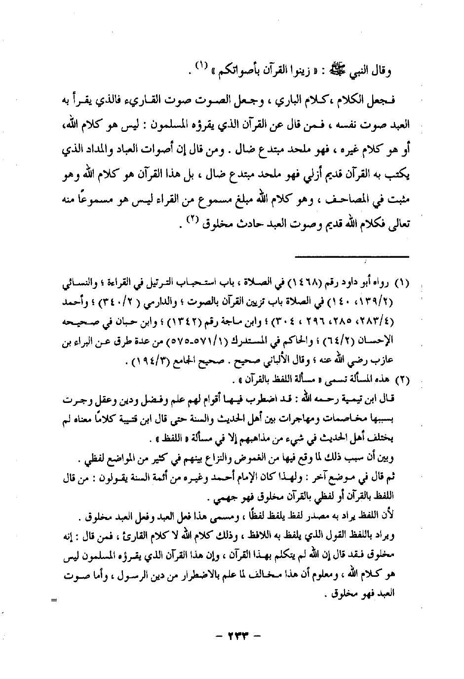 فجعل الكلام، كلام الباري، وجعل الصوت صوت القارئ فالذي يقرأ به العبد صوت نفسه، فمن قال عن القرآن الذي يقرؤه المسلمون: ليس هو كلام اللَّه، أو هو كلام غيره، فهو ملحد مبتدع ضال. ومن قال إن أصوات العباد والمداد الذي كتب به القرآن قديم أزلي فهو ملحد مبتدع ضال، بل هذا القرآن هو كلام اللَّه وهو مثبت في المصاحف، وهو كلام اللَّه مبلغ مسموع من القراء ليس هو مسموعًا منه تعالى فكلام اللَّه قديم وصوت العبد حادث مخلوق (¬2).