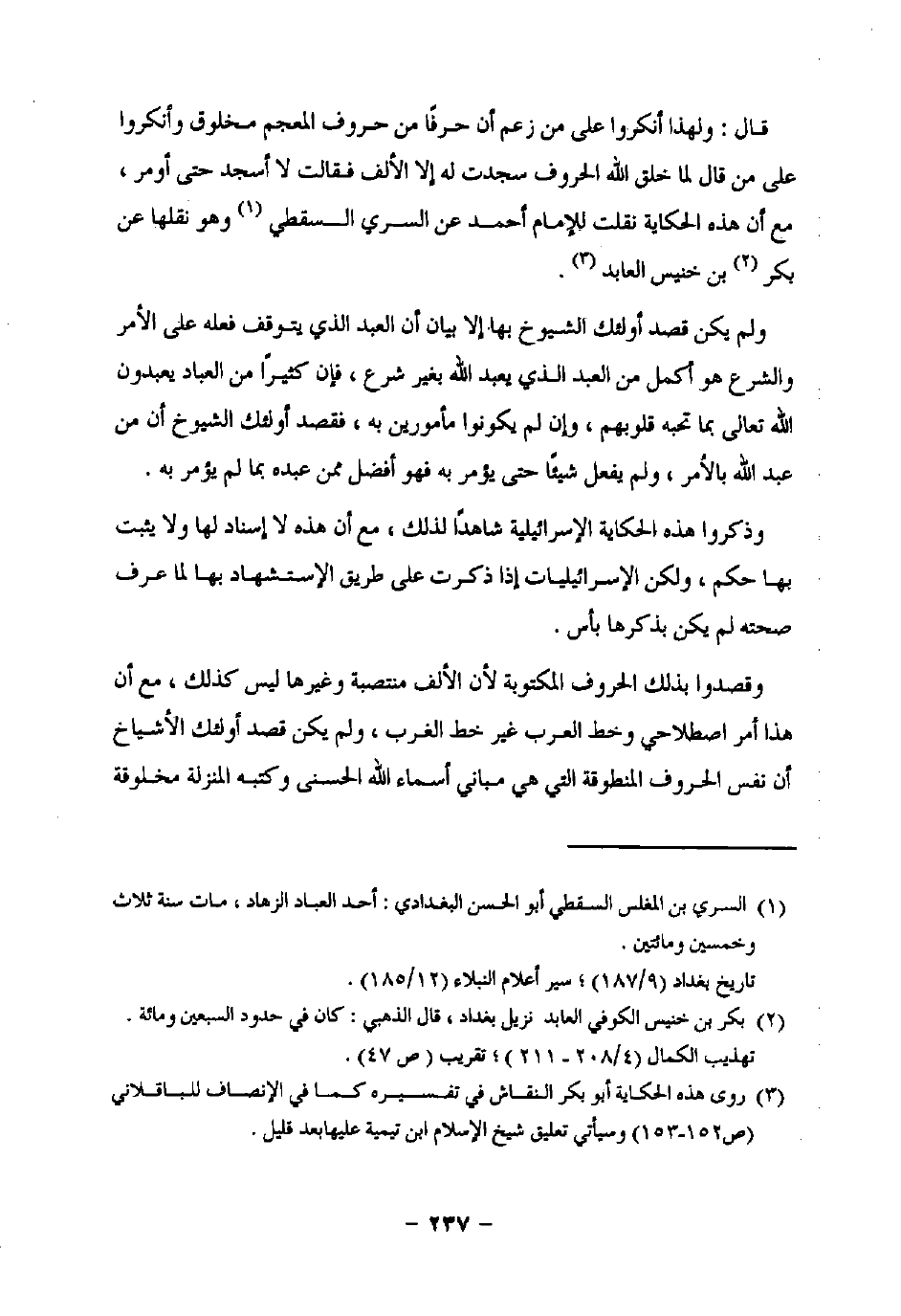 قال: ولهذا أنكروا على من زعم أن حرفًا من حروف المعجم مخلوق وأنكروا على من قال لما خلق اللَّه الحروف سجدت له إلا الألف فقالت لا أسجد حتى أومر، مع أن هذه الحكاية نقلت للإمام أحمد عن السري السقطي (¬1) وهو نقلها عن بكر (¬2) بن خنيس العابد (¬3).