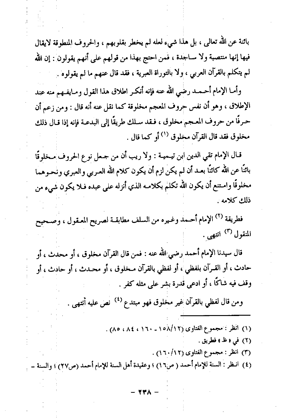 قال الإمام تقي الدين ابن تيمية: ولا ريب أن من جعل نوع الحروف مخلوقًا بائنًا عن اللَّه كائنًا بعد أن لم يكن لزم أن يكون كلام اللَّه العربي والعبري ونحوهما مخلوقًا وامتنع أن يكون اللَّه تكلم بكلامه الذي أنزله على عبده فلا يكون شيء من ذلك كلامه.
