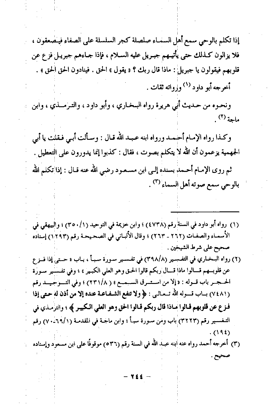 (¬2) رواه البخاري في المسير (8/ 398) في تفسير سورة سبأ، باب "حتى إذا فزع عن قلوبهم قالوا ماذا قال ربكم قالوا الحق وهو العلي الكبير"؛ وفي تفسير سورة الحجر باب قوله: "إلا من استرق السمع" (8/ 231)؛ وفي التوحيد رقم (7481) باب قول اللَّه تعالى: {وَلَا تَنْفَعُ الشَّفَاعَةُ عِنْدَهُ إِلَّا لِمَنْ أَذِنَ لَهُ حَتَّى إِذَا فُزِّعَ عَنْ قُلُوبِهِمْ قَالُوا مَاذَا قَالَ رَبُّكُمْ قَالُوا الْحَقَّ وَهُوَ الْعَلِيُّ الْكَبِيرُ}؛ والترمذي في التفسير رقم (3223) باب ومن سورة سبأ؛ وابن ماجة في المقدمة (1/ 69 - 70) رقم (194).