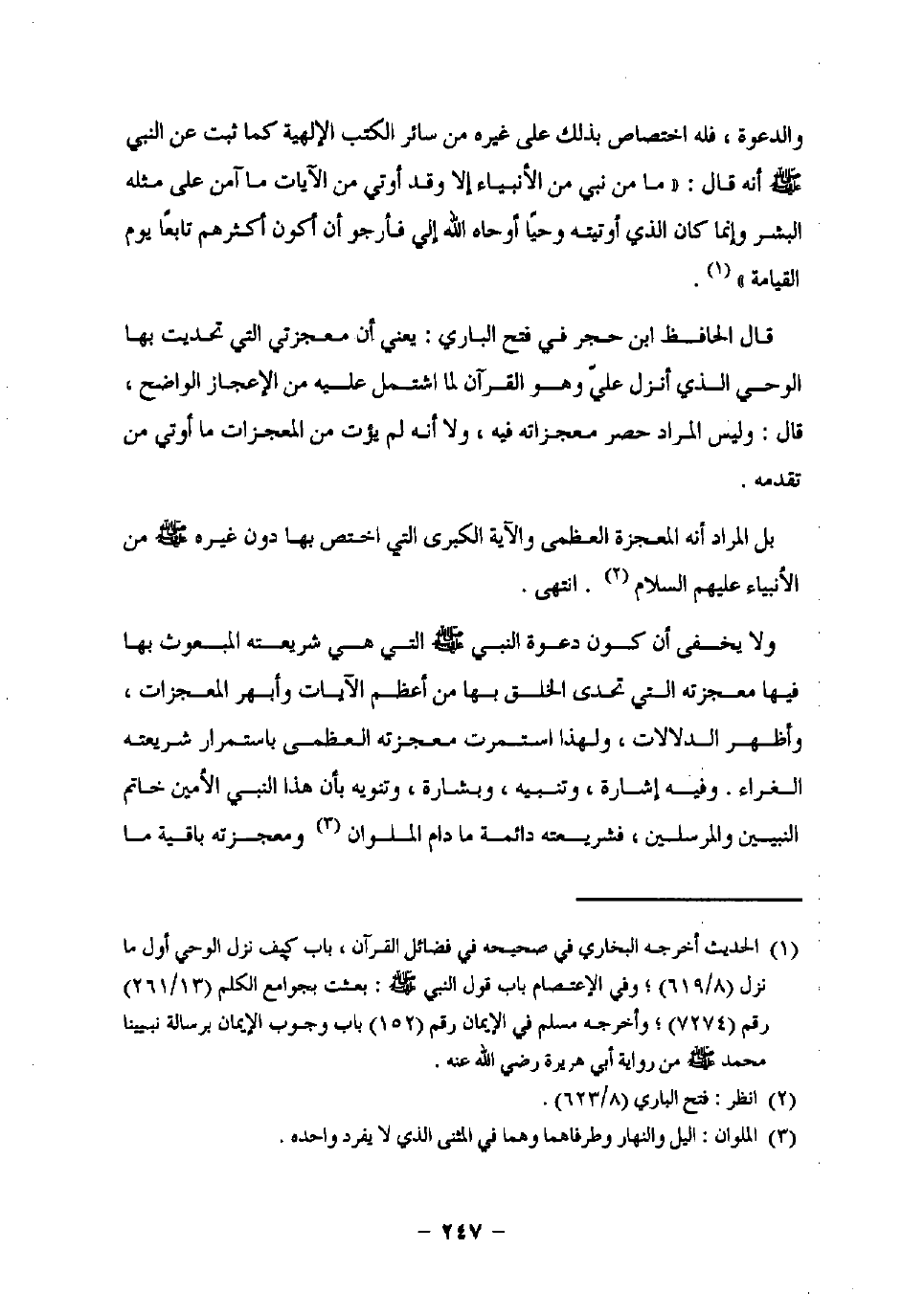 بل المراد أنه المعجزة العظمى والآية الكبرى التي اختص بها دون غيره -صلى اللَّه عليه وسلم- من الاُنبياء عليهم السلام (¬2). انتهى.