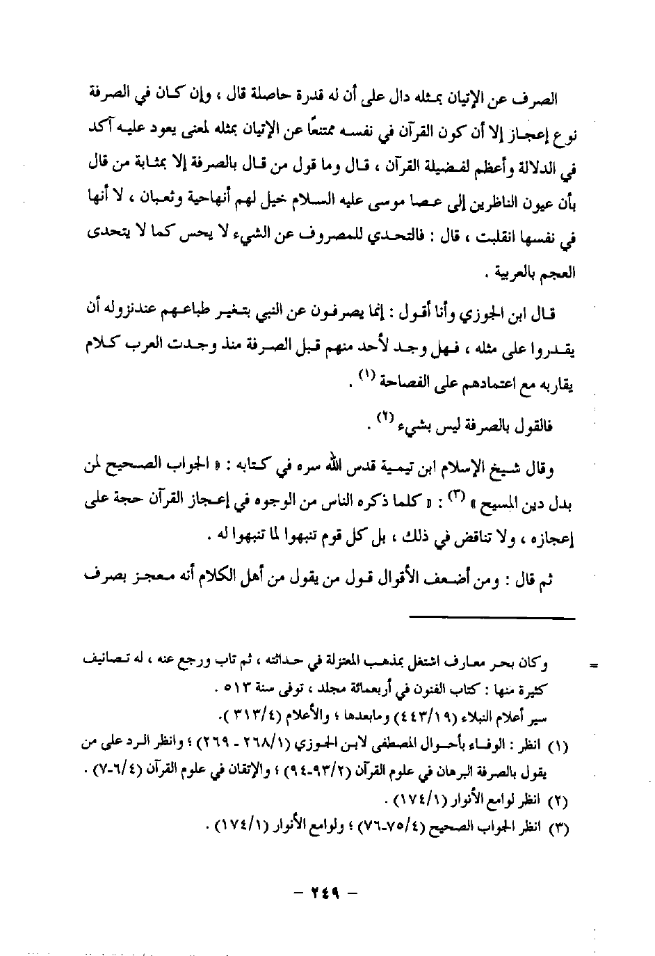 (¬1) انظر: الوفاء بأحوال المصطفى لابن الجوزي (1/ 268 - 269)، وانظر الرد على من يقول بالصرفة البرهان في علوم القرآن (2/ 93 - 94)؛ والإتقان في علوم القرآن (4/ 6 - 7).