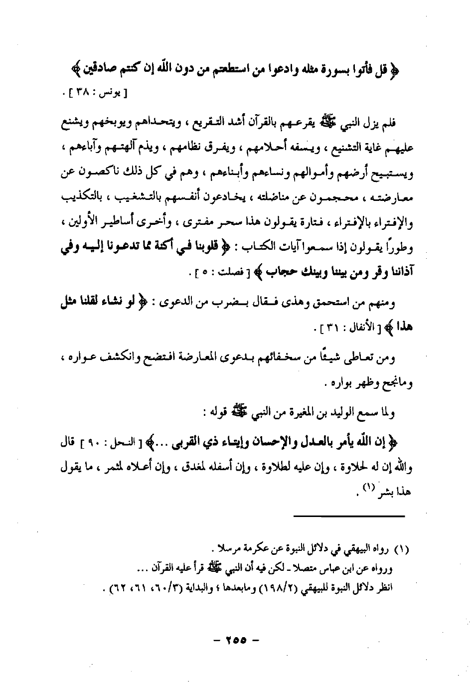 ولما سمع الوليد بن المغيرة من النبي -صلى اللَّه عليه وسلم- قوله: {إِنَّ اللَّهَ يَأْمُرُ بِالْعَدْلِ وَالْإِحْسَانِ وَإِيتَاءِ ذِي الْقُرْبَى. . .} [النحل: 90] قال واللَّه إن له لحلاوة، وإن عليه لطلاوة، وإن أسفله لمغدق، وإن أعلاه لمثمر، ما يقول هذا بشر (¬1).